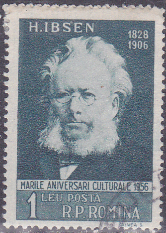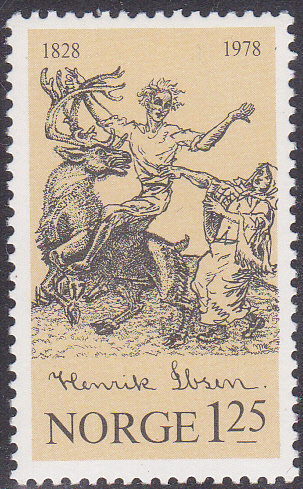 Auf der zweiten Marke Norwegens zum 150. Geburtstag von Henrik Ibsen wird Peer Gynt mit dem Rentierhirsch nach einer Zeichnung von Per Larson Krohg (1889-1965) abgebildet.