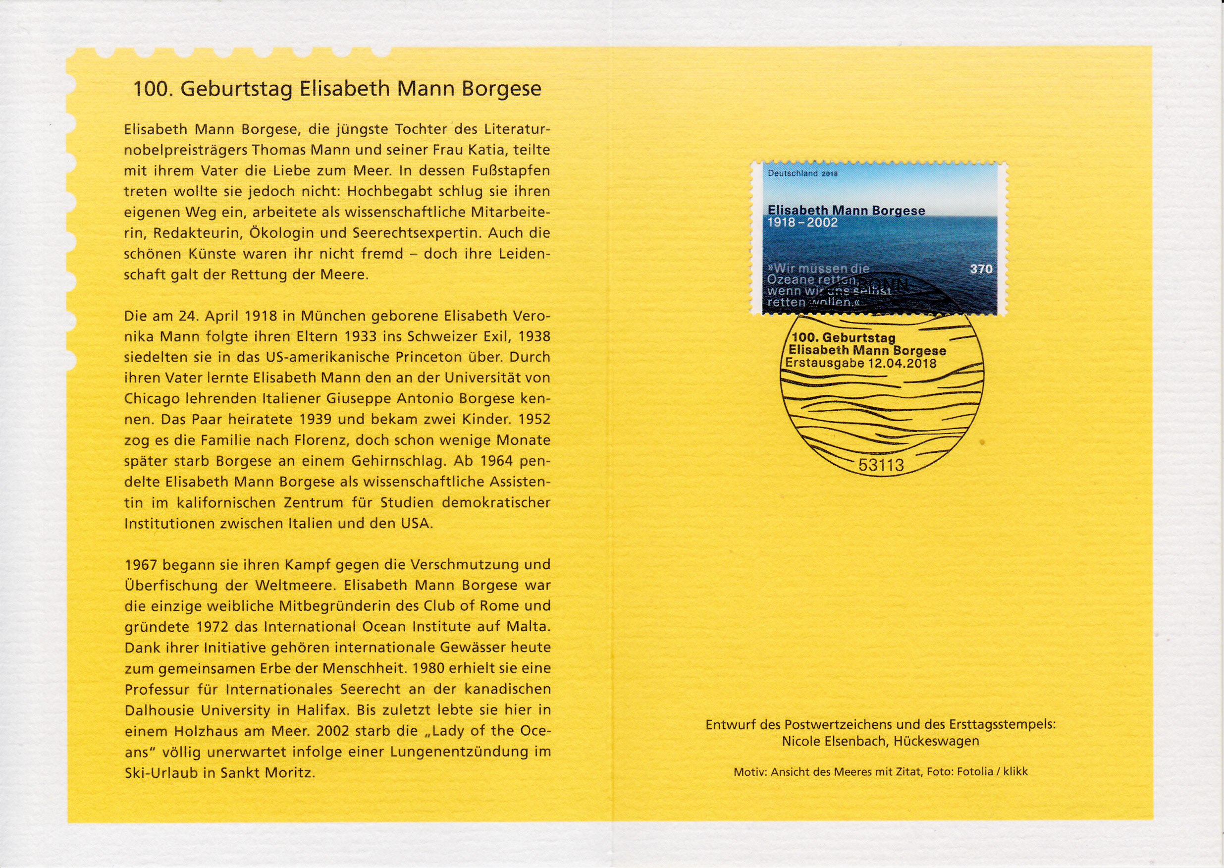 Elisabeth Veronika Mann Borgese (geb. 24. April 1918 in München; gest. 8. Februar 2002 in St. Moritz, Schweiz) war das fünfte Kind und die jüngsteTochter von Katia Mann geb. Pringsheim und dem Nobelpreisträger Thomas Mann. Sie war eine Seerechtsexpertin und Ökologin sowie Publizistin, Sachbuchautorin, Autorin von Erzählungen und Gründerin der wissenschaftlichen Zeitschrift Ocean Yearbook.