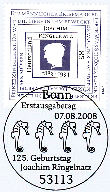 Es folgt eine Marke mit dem Ersttagsonderstempel aus Bonn. Im Stempel werden Seepferdchen gezeigt, die auf das Gedicht "Seepferdchen" aus der Feder von Joachim Ringelnatz hinweisen sollen.