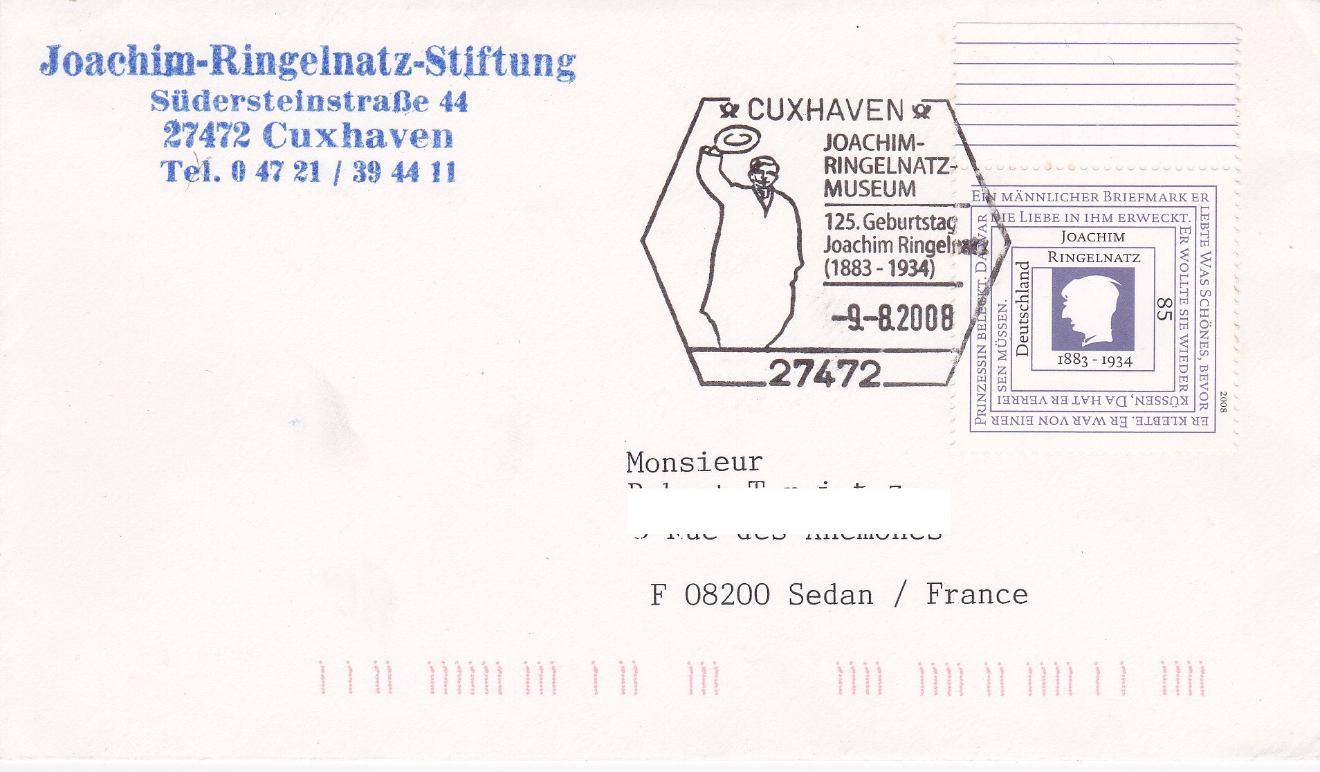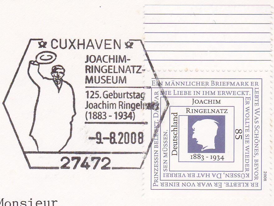 Sonderstempel vom 9.8.2008 aus Cuxhaven zum 125. Geburtstag von Joachim Ringelnatz.
