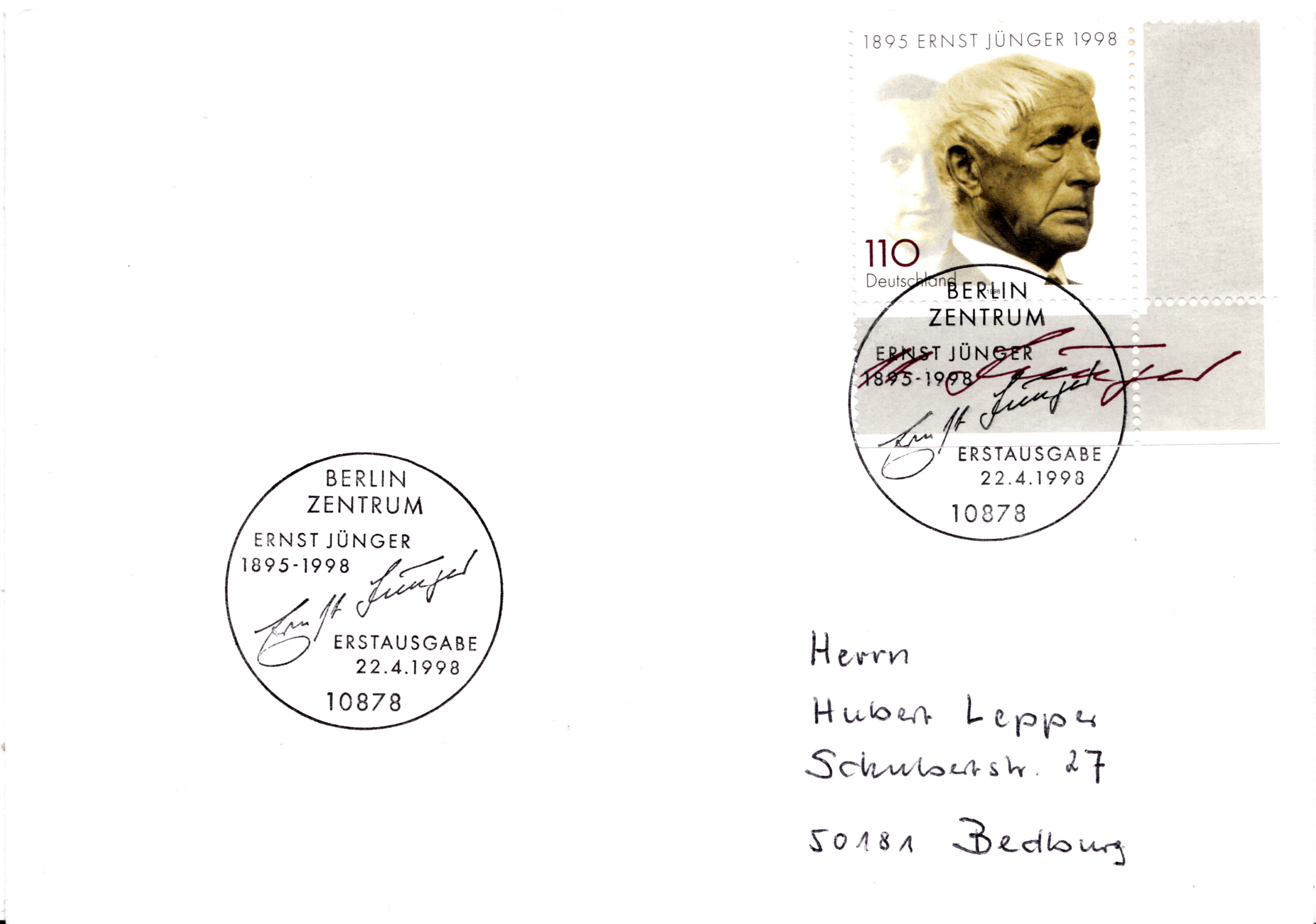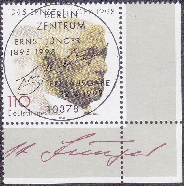 Zum Tod von Ernst Jünger ist 1998 eine Marke (MiNr 1984) mit seinem Porträt erschienen. Hier ein Eckrandstück mit dem Ersttagsonderstempel Berlin.