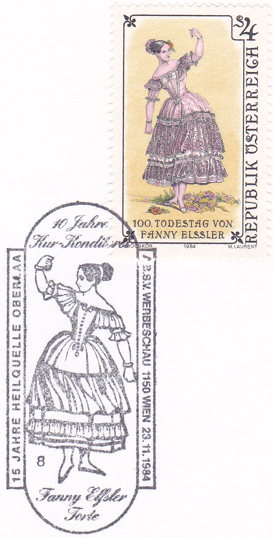 Zum 100. Todestag von Fanny Elßler ist in Österreich eine Marke (MiNr 1796 erschienen. Sie zeigt Fanny Elßler tanzt die Cachucha im Ballett "Le diable boiteux" ("Der hinkende Teufel",1842). Die Cachucha ist ein spanischer (andalusischer) Solotanz im 3/4- bzw. 3/8-Takt, der dem Bolero ähnelt.