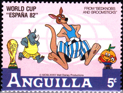 Die Marke aus Anguilla zu 5 Cent (MiNr 504) aus der Serie zur Fußball WM 1982 bildet das Känguruh ab, das im Film mit dem Ball in seinem Beutel über das Spielfeld hoppelt.