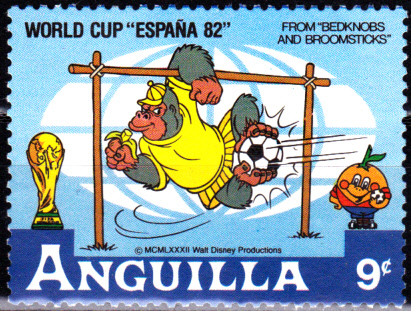 Auf der Marke aus Anguilla zu 7 Cent (MiNr 505) aus der Serie zur Fußball WM 1982 ist der König der Tiere (der Löwe) zu sehen, wie er den Ball in seiner Krone über das Spielfeld trägt.