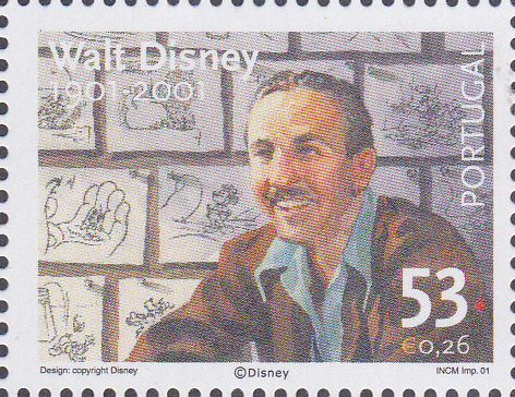 In der Serie "100. Geburtstag von Walt Disney" aus Portugal wird ein Porträt von Walt Disney auf einer Marke (MiNr 2540) gezeigt.