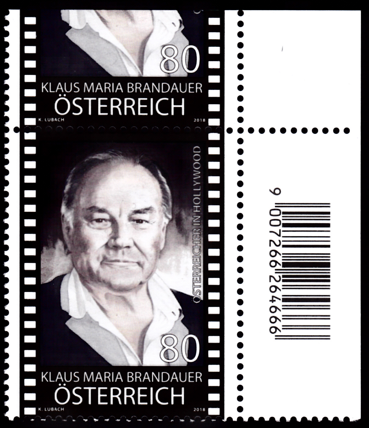 In der Reihe "Österreicher in Hollywood" ist 2018 in Österreich diese Marke (MiNr 3428) mit einem Porträt von Klaus Maria Brandauer erschienen. Hier ein Eckrandstück mit EAN-Codierung.