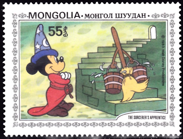 Diese am 1.1.1983 erschienene Marke aus einer Serie der Mongolei (MiNr 1531) zeigt Mickey Mouse als Zauberlehrling mit dem Zauberer (am linken Markenrand sieht man dessen Hand mit dem Besen).