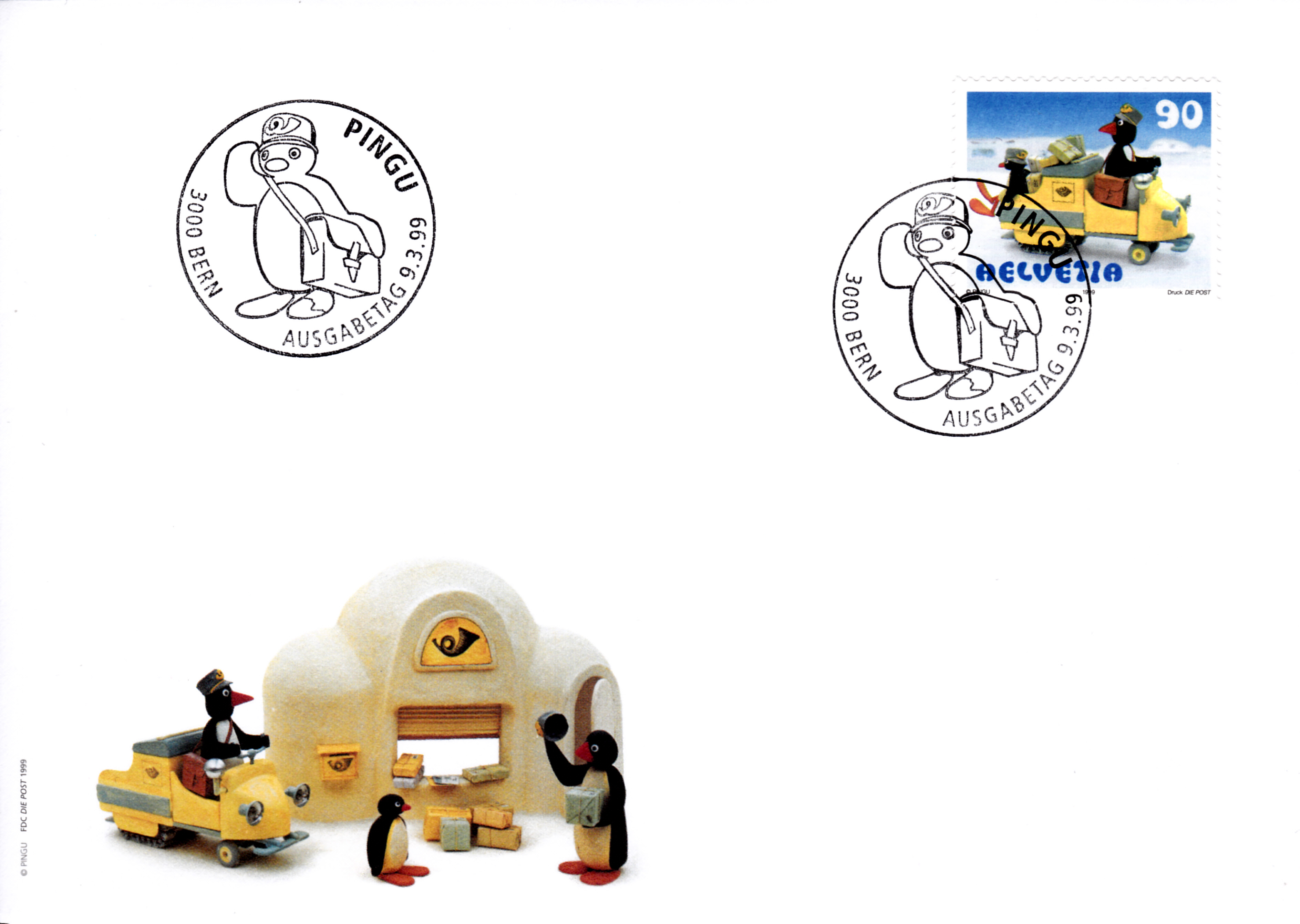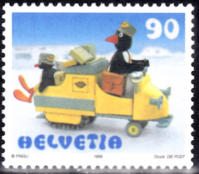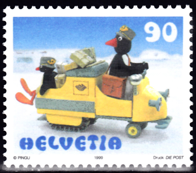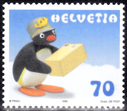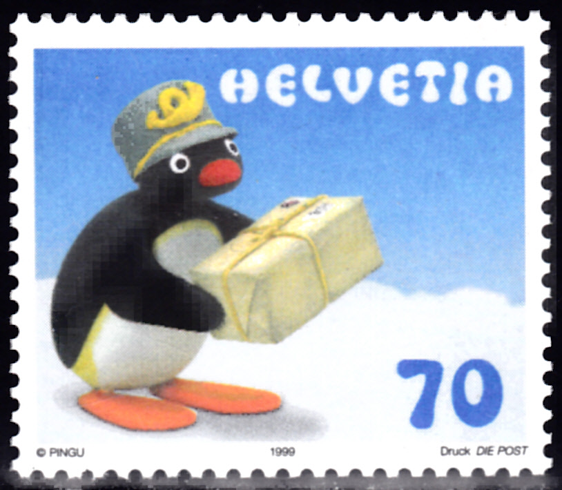 Aus der Schweiz kommt diese Marke (MiNr 1707) mit Klein-Pingu als Postbote.