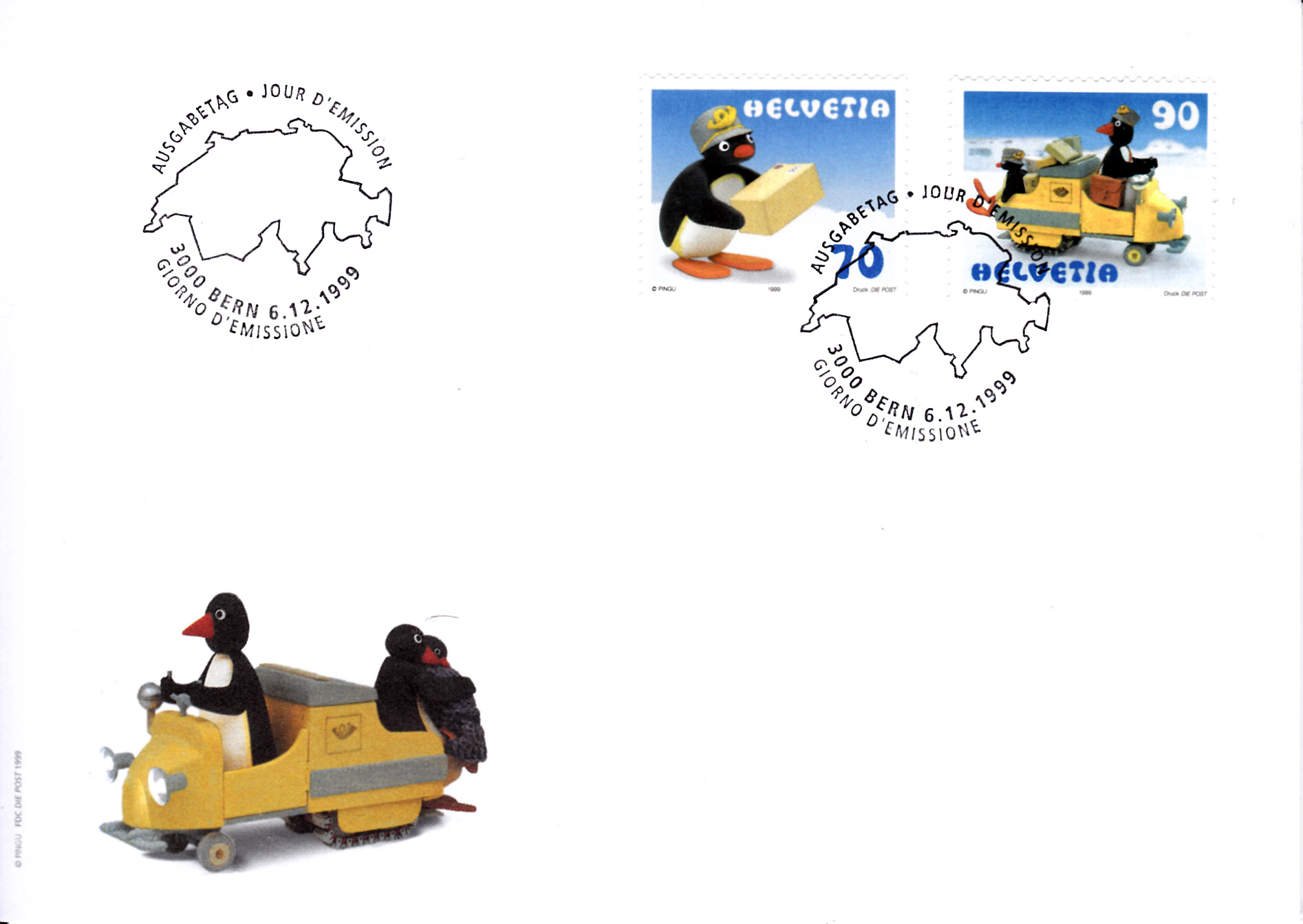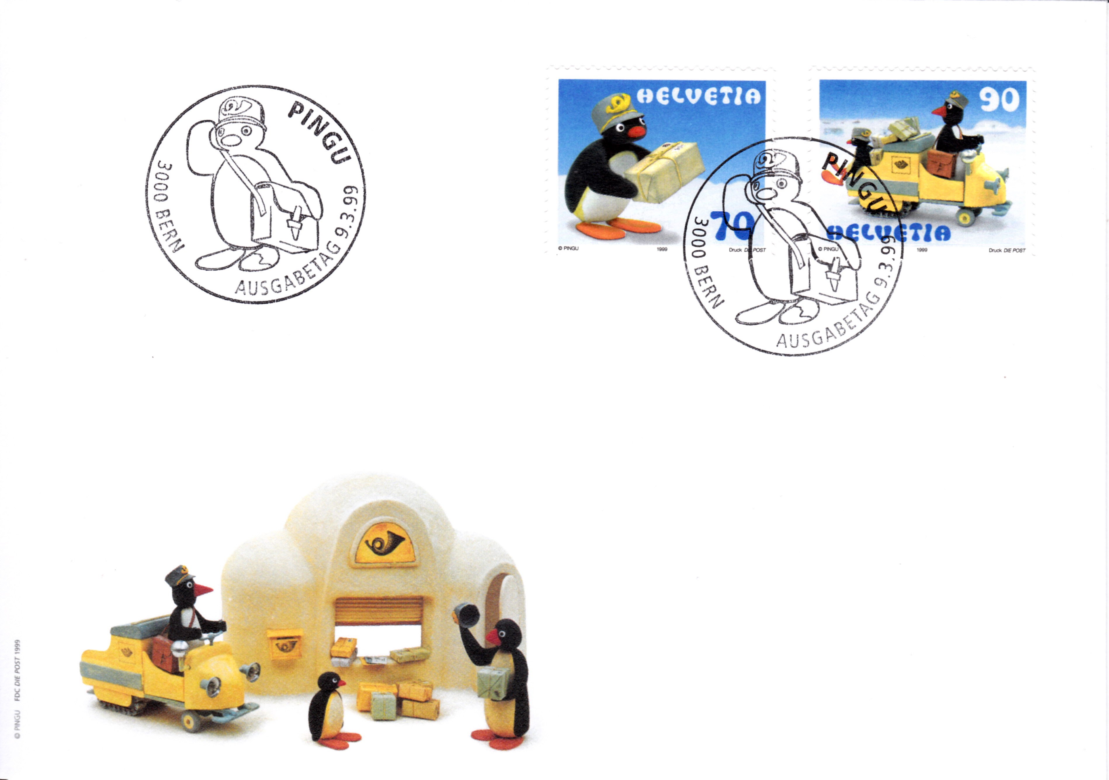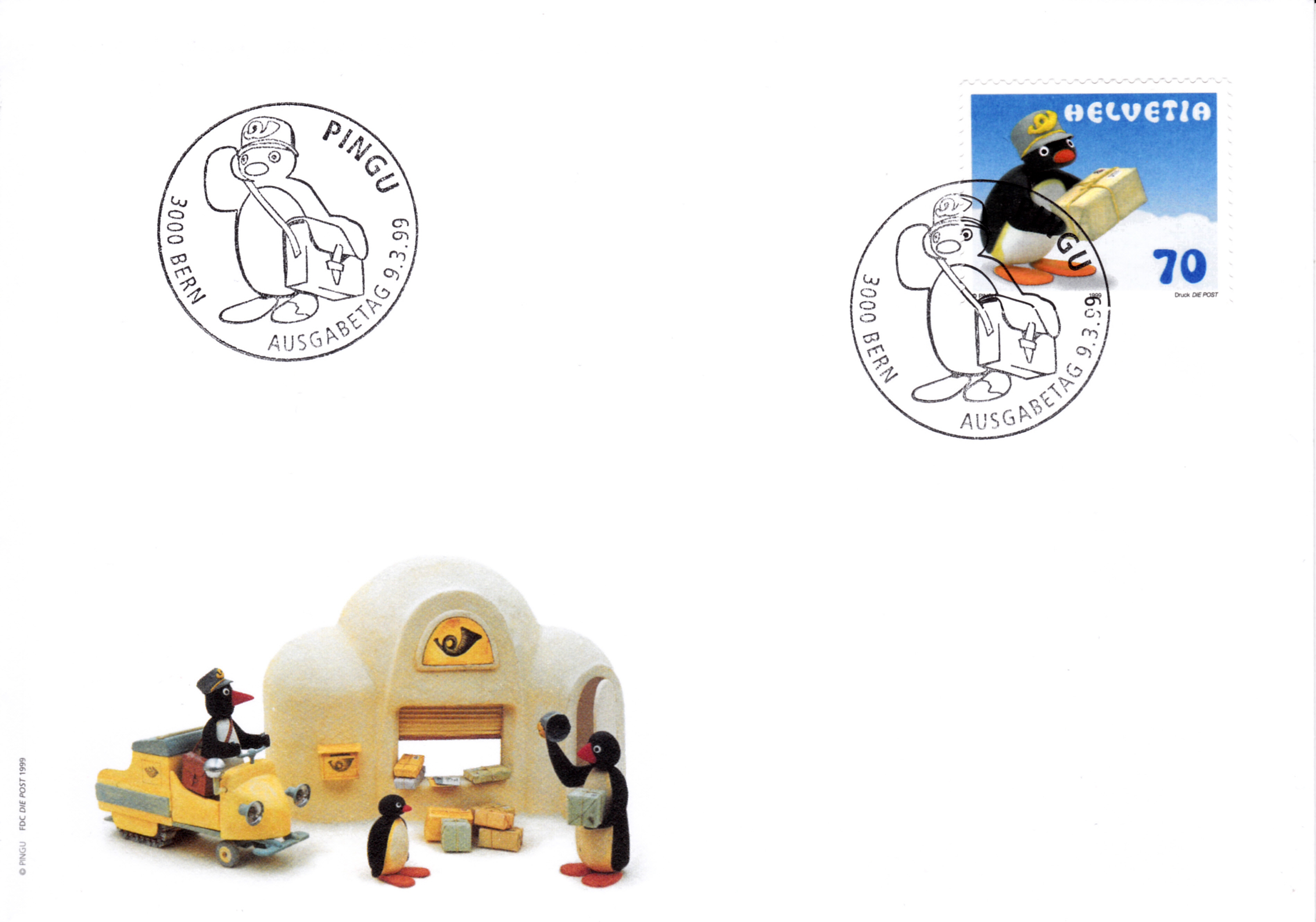 Aus der Schweiz kommt diese Marke (MiNr 1707) mit Klein-Pingu als Postbote.