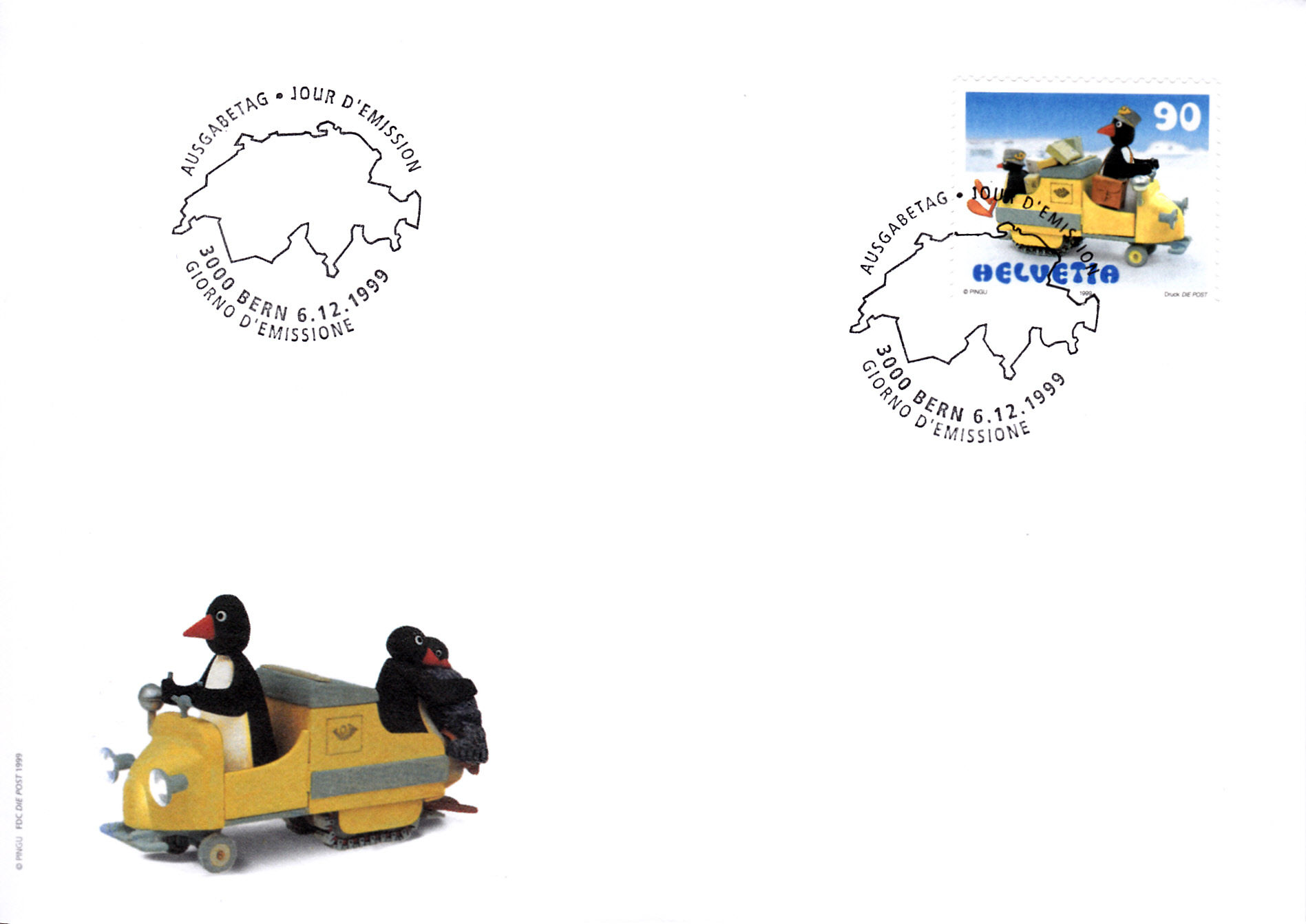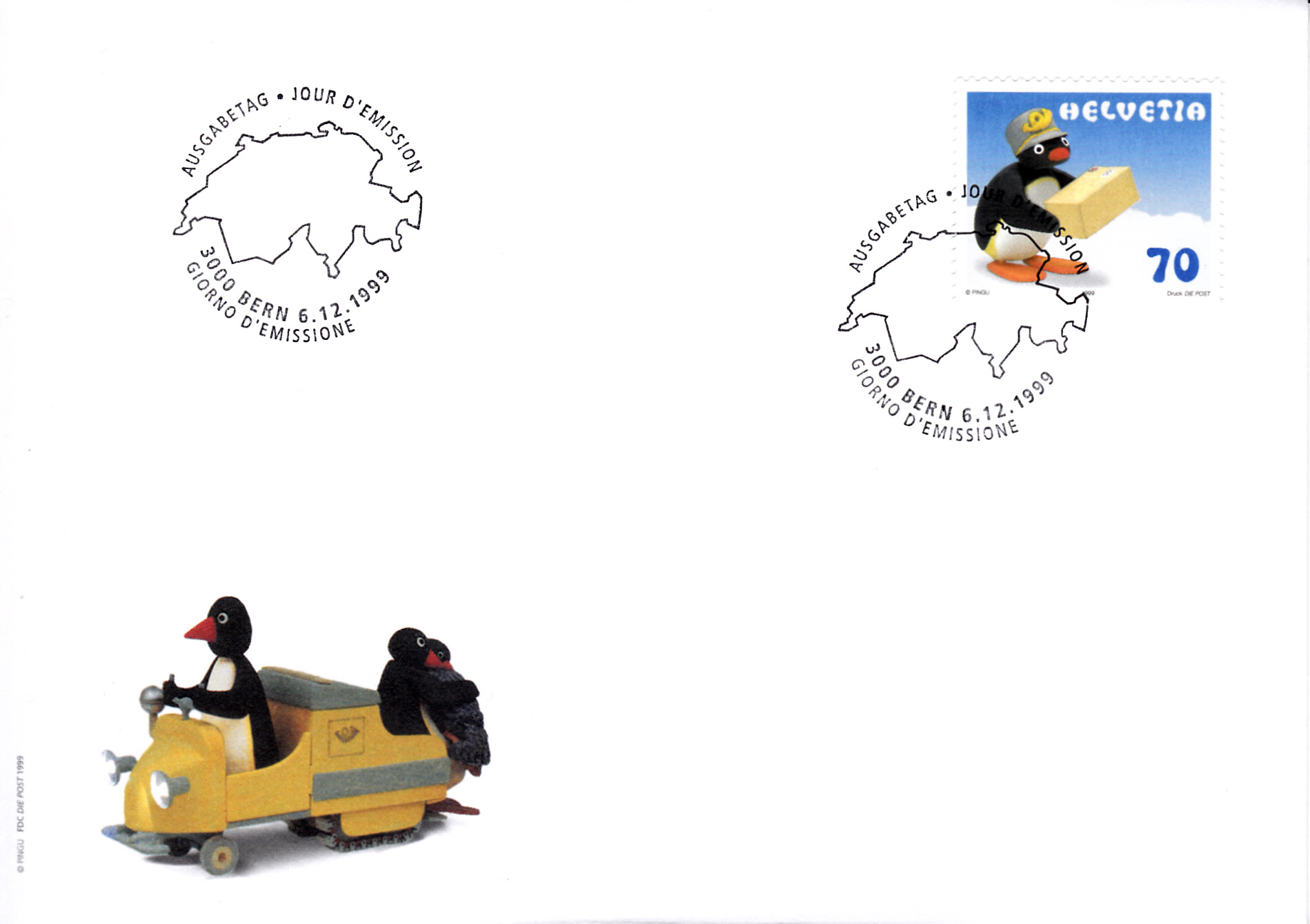 Eine zweite Marke (MiNr 1708) zeigt Papa-Pingu und Klein-Pingu im Post-Schneemobil.