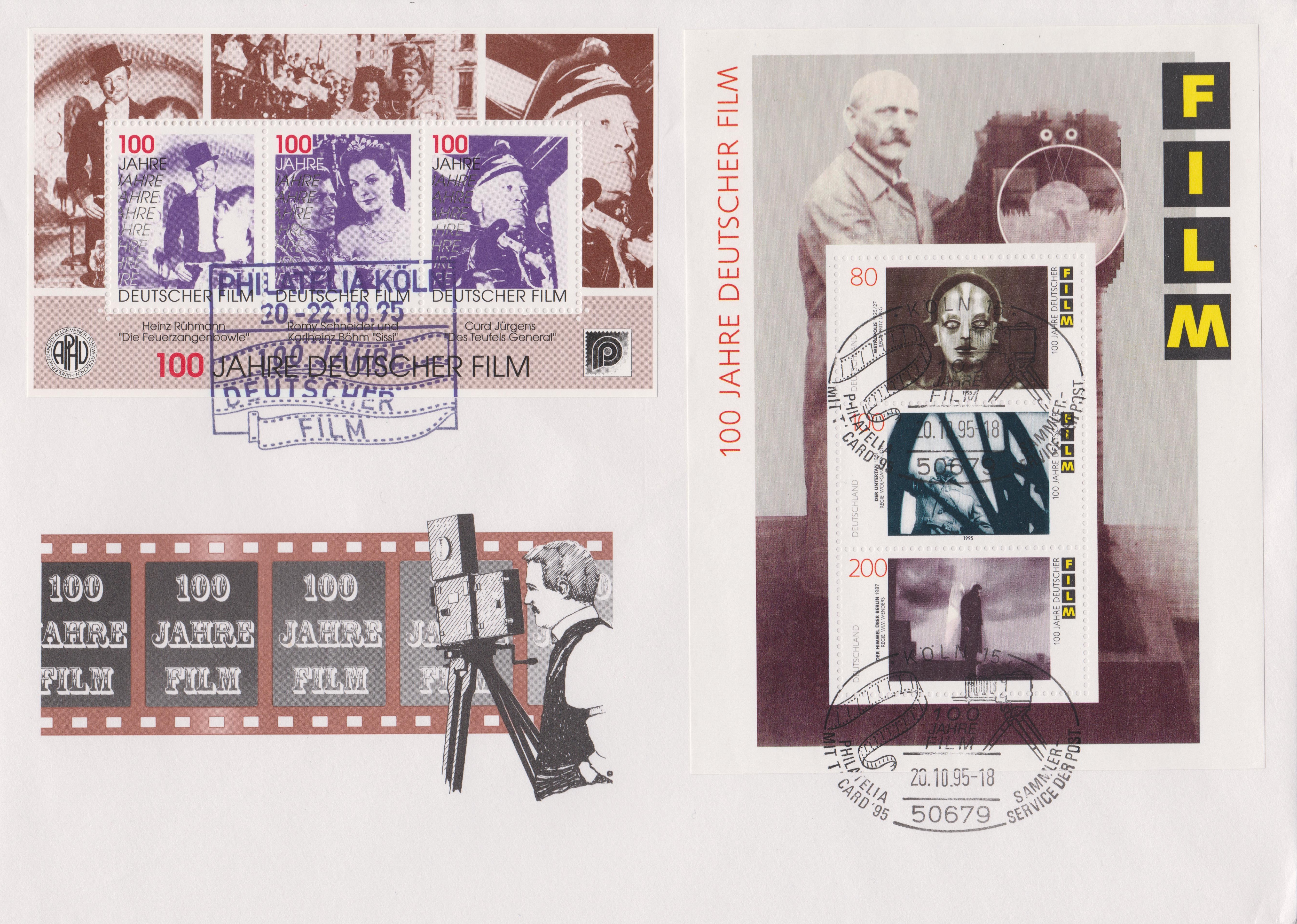 Bei der PHILATELIA KÖLN gab es dieses schöne Beispiel von "Kartonphilatelie", indem ein Block 33 am 20.10.1995 mit dem Sonderstempel zur Ausstellung "100 JAHRE FILM" versehen wurde und dazu ein Vignettenblock zum Thema "100 JAHRE DEUTSCHER FILM" verklebt wurde, die auf den ersten Blick wie ein Postwertzeichen aussieht: