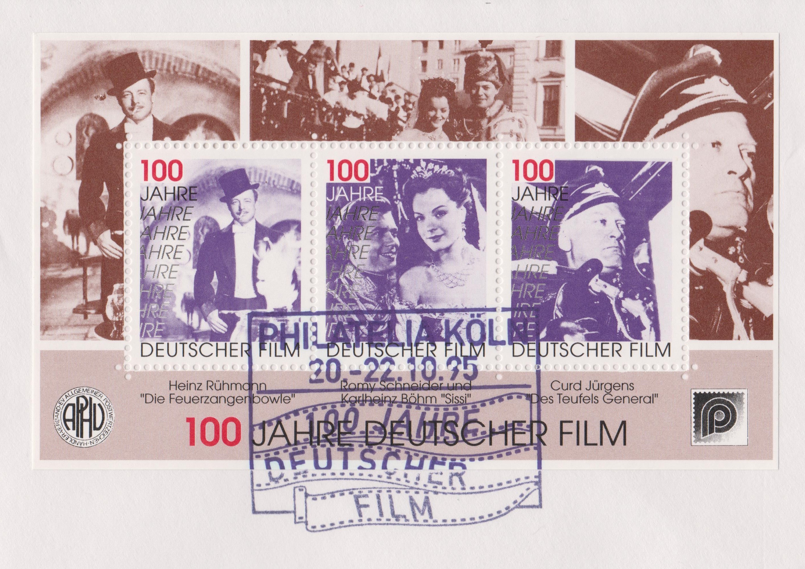 Bundesrepublik Deutschland Block 33 erschien am 06.09.1995 zum Thema „100 Jahre deutscher Film“. Er enthält 3 Marken untereinander zu 80 Pf (Filmszene aus dem Film Metropolis), 100 Pf (Filmszene aus dem Film Der Untertan) und 200 Pf (Filmszene aus dem Film Der Himmel über Berlin).