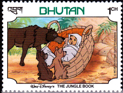 In Bhutan erschien diese Marke (MiNr 781) mit dem Motiv "Der Wolf Rama nimmt sich Mogli an"