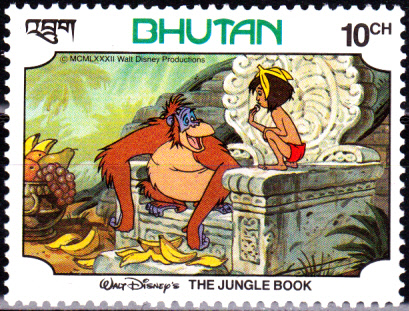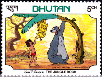 Dieser Marke aus Bhutan (MiNr 785) zeigt die Szene, wie Balu der Bär eine Bananenstaude verbiegt, damit Mogli eine Banane pflücken kann.