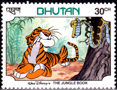 Diese Marke aus Bhutan (MiNr 787) zeigt den Tiger Shir Khan und die Riesenschlange Kaa.
