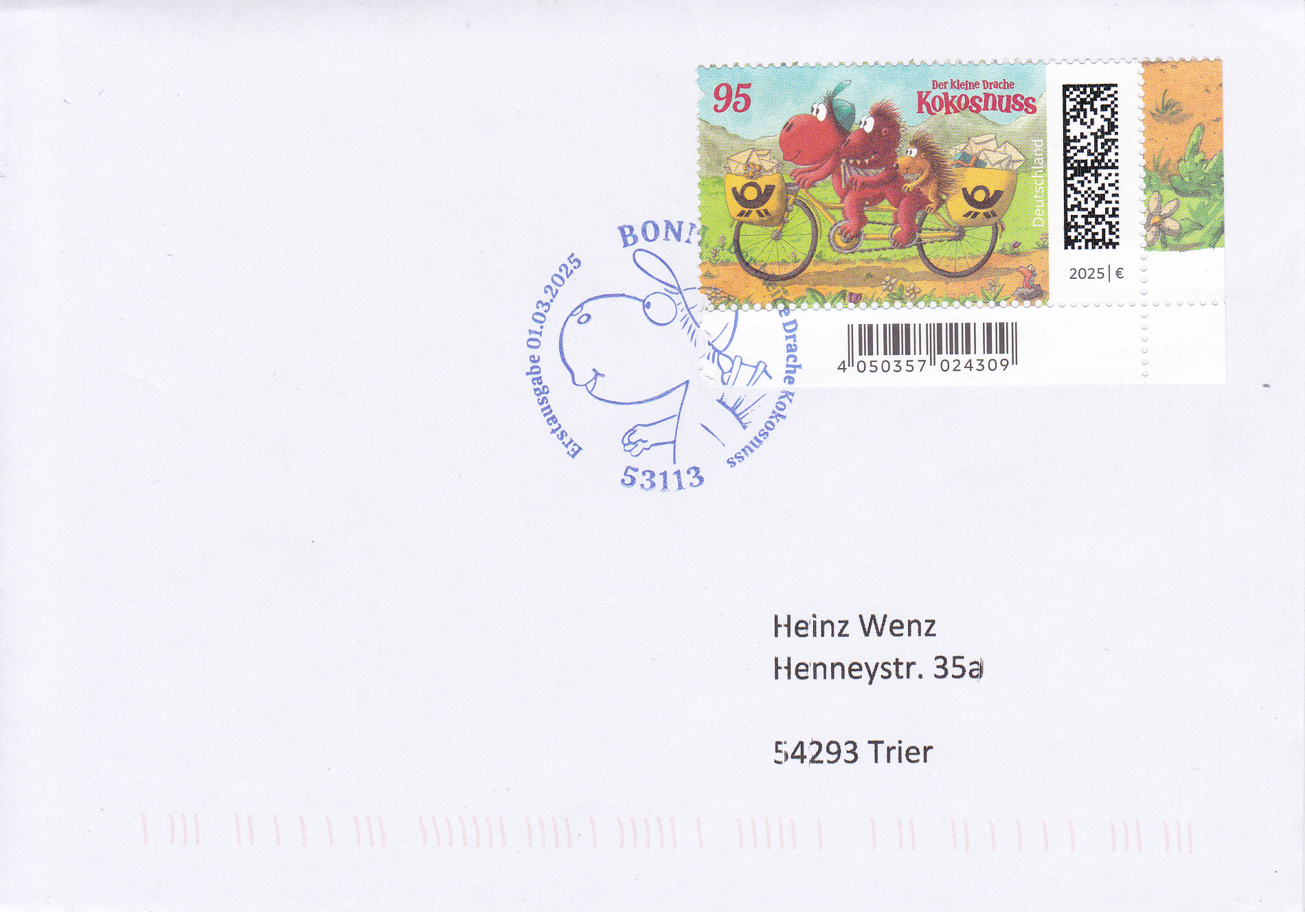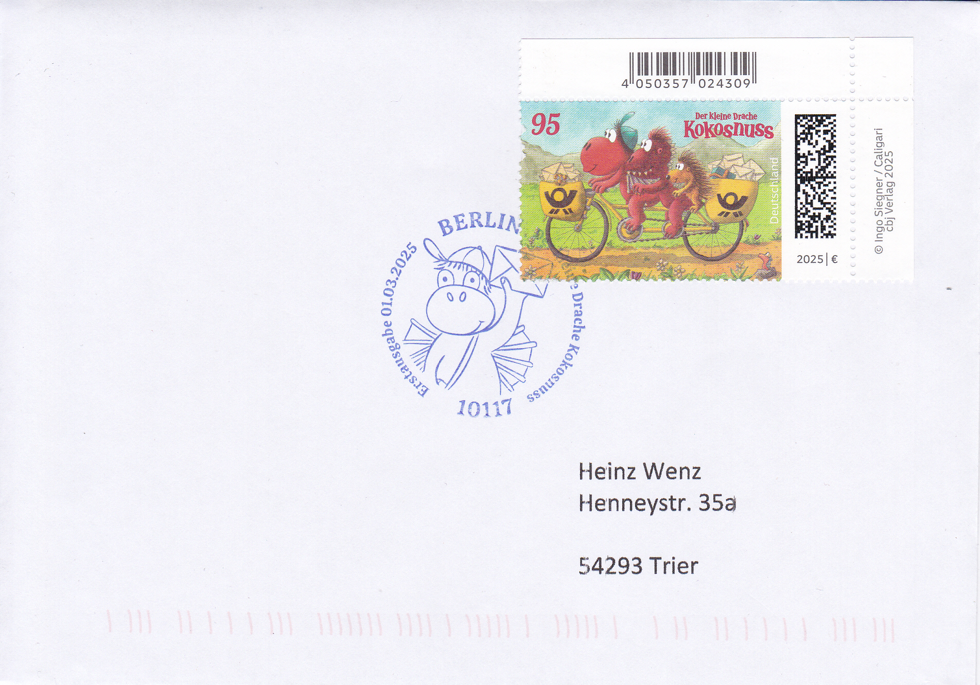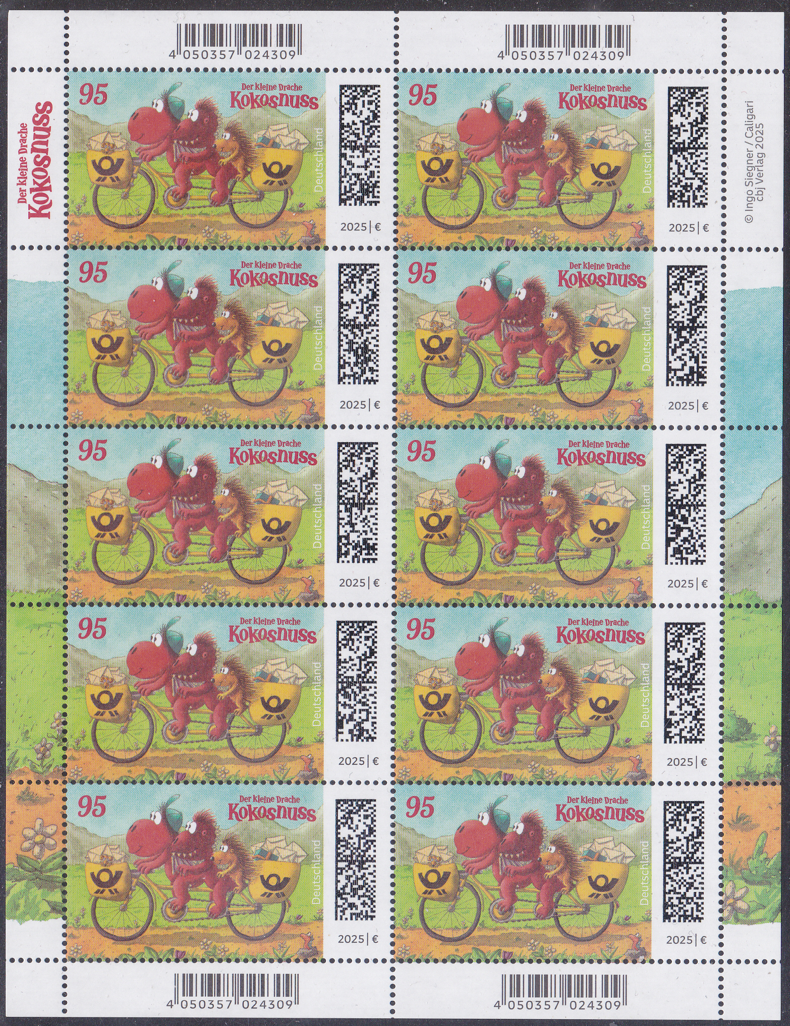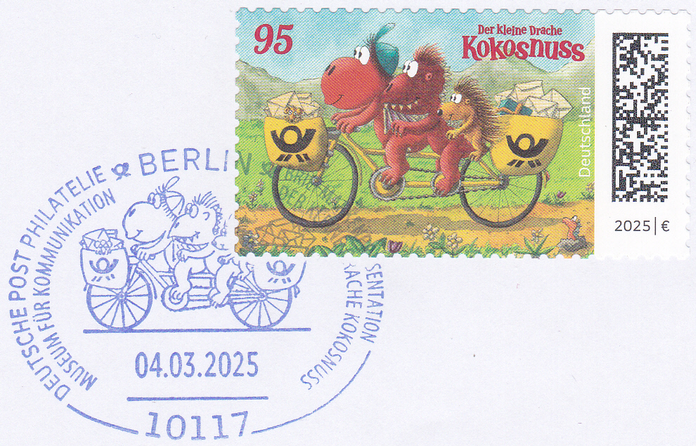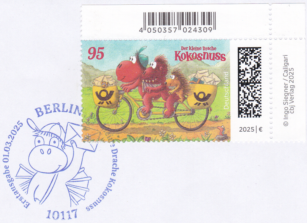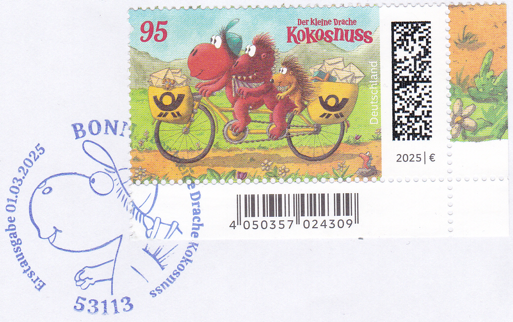 Bei der Deutschen Post ist eine Marke (MiNr 3895) mit der Abbildung "Drache Kokosnuss, Drache Oskar und Stachelschwein Matilda auf Postfahrrad" erschienen. Hier zeige ich ein Eckrandstück mit EAN-Codierung.