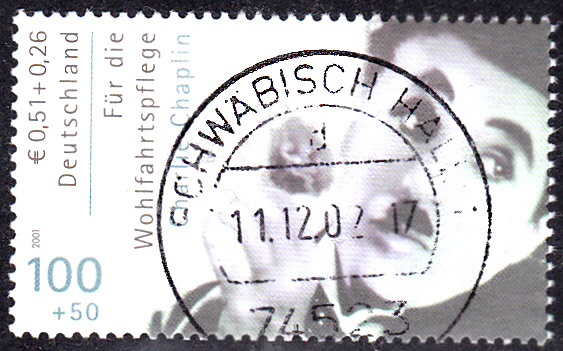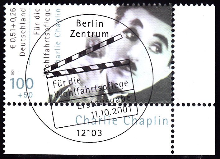 Eine Marke zu 100+50Pf aus der Wohlfahrtsmarkenserie 2001 (MiNr 2218) zeigt ein Porträt von Charlie Chaplin.
