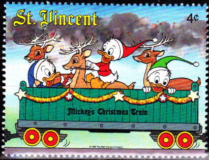 Am 23.12.1988 erschien in St.Vincent eine Serie zu Weihnachten mit Walt Disney Figuren in einem Weihnachtszug. Diese Marke aus der Serie (MiNr 1140) zeigt Tick, Trick und Track auf einem Eisenbahnwaggon mit Rentieren.