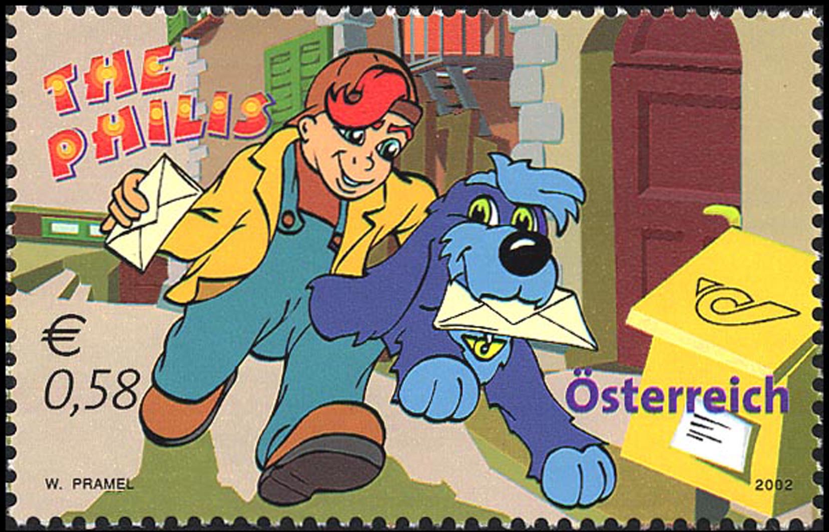Bei der Post in Österreich erschienen dazu Briefmarken. Hier eine Marke (MiNr 2372) die Mel und Lucy beim Briefeschreiben zeigt.