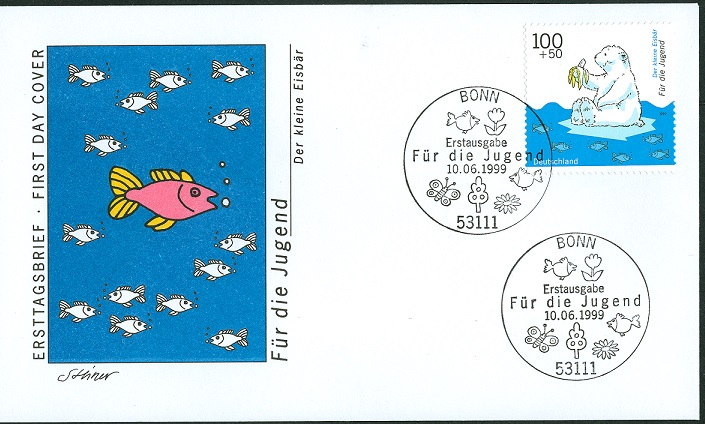 Nicht zu vergessen die MiNr. 2055 einer Bundausgabe des Jahres 1999. Auf der der kleine Eisbär als Motiv Für die Jugend auf einer Eisscholle sitzt.