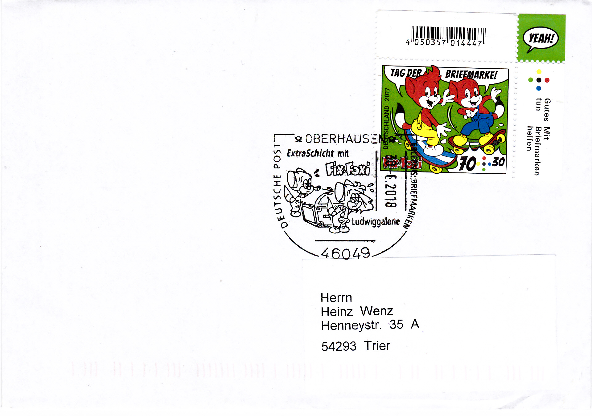 Hier folgt noch einmal der gleiche Sonderstempel aus Oberhausen mit der Abbildung von Fix und Foxi beim Tragen einer Truhe. OmmUnterschied zum vorigen Beleg passt hier auch das Markenmotiv viel besser zum Stempelmotiv. Bei der Aufnahme von Briefen mit Sonderstempel in ein Exponat für eine Wettbewerbsausstellung sollten die Aussteller nach Möglichkeit Briefe bevorzugen, bei denen eine motivliche Übereinstimmen zwischen Stempel- und Markenbild vorliegt.