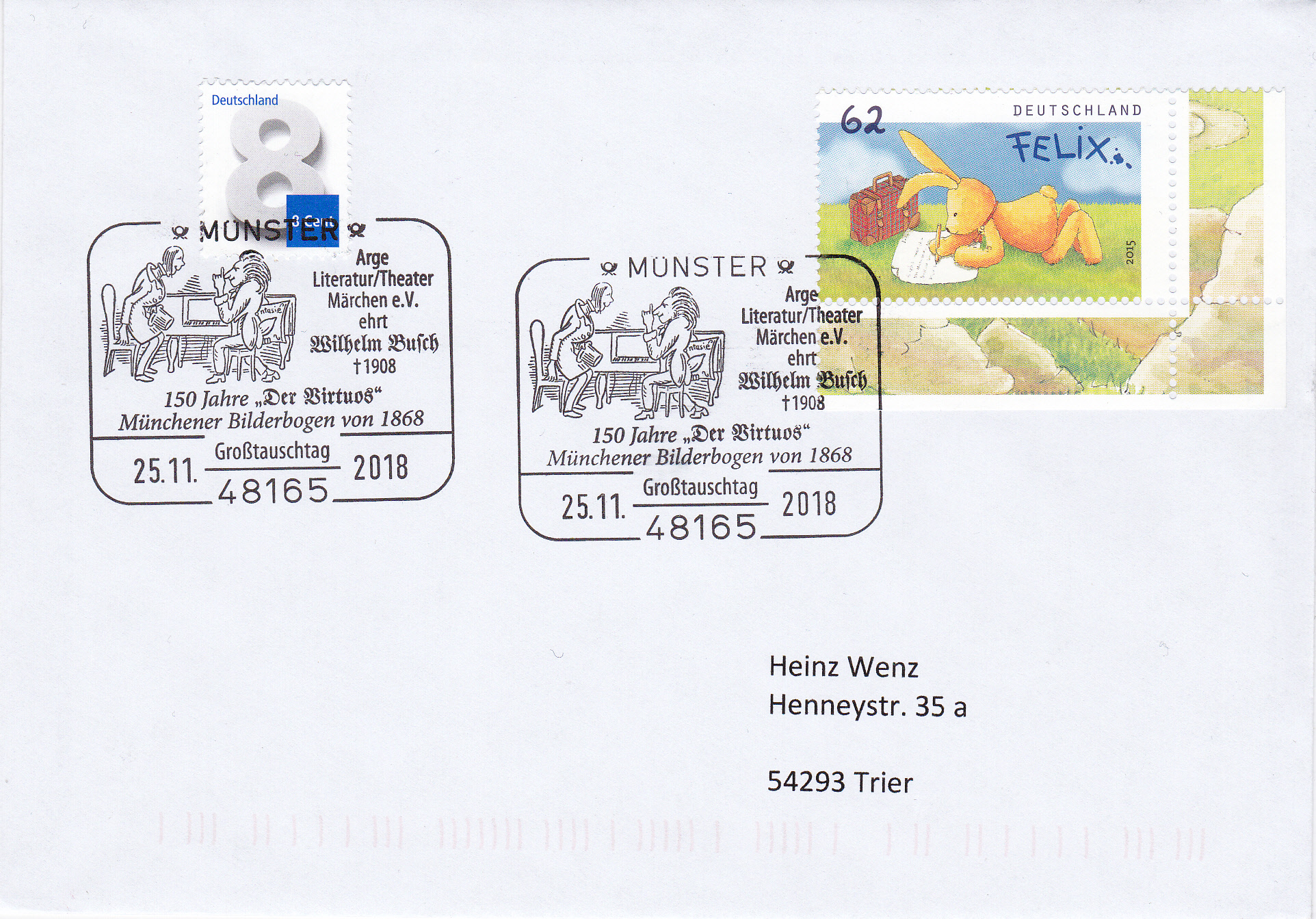 Im Sonderstempel vom 25.11.2018 aus Münster ist das erste Bild aus "Der Virtuos" von Wilhelm Busch zu sehen.