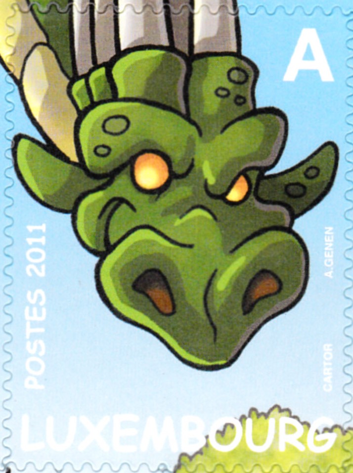 Auf vier Marken aus einem Block werden Figuren aus "De Leschte Ritter" gezeigt. Diese Marke (MiNr 1908) zeigt einen Drachen. Die Nominale zur Zeit der Ausgabe betrug 0.60 €.