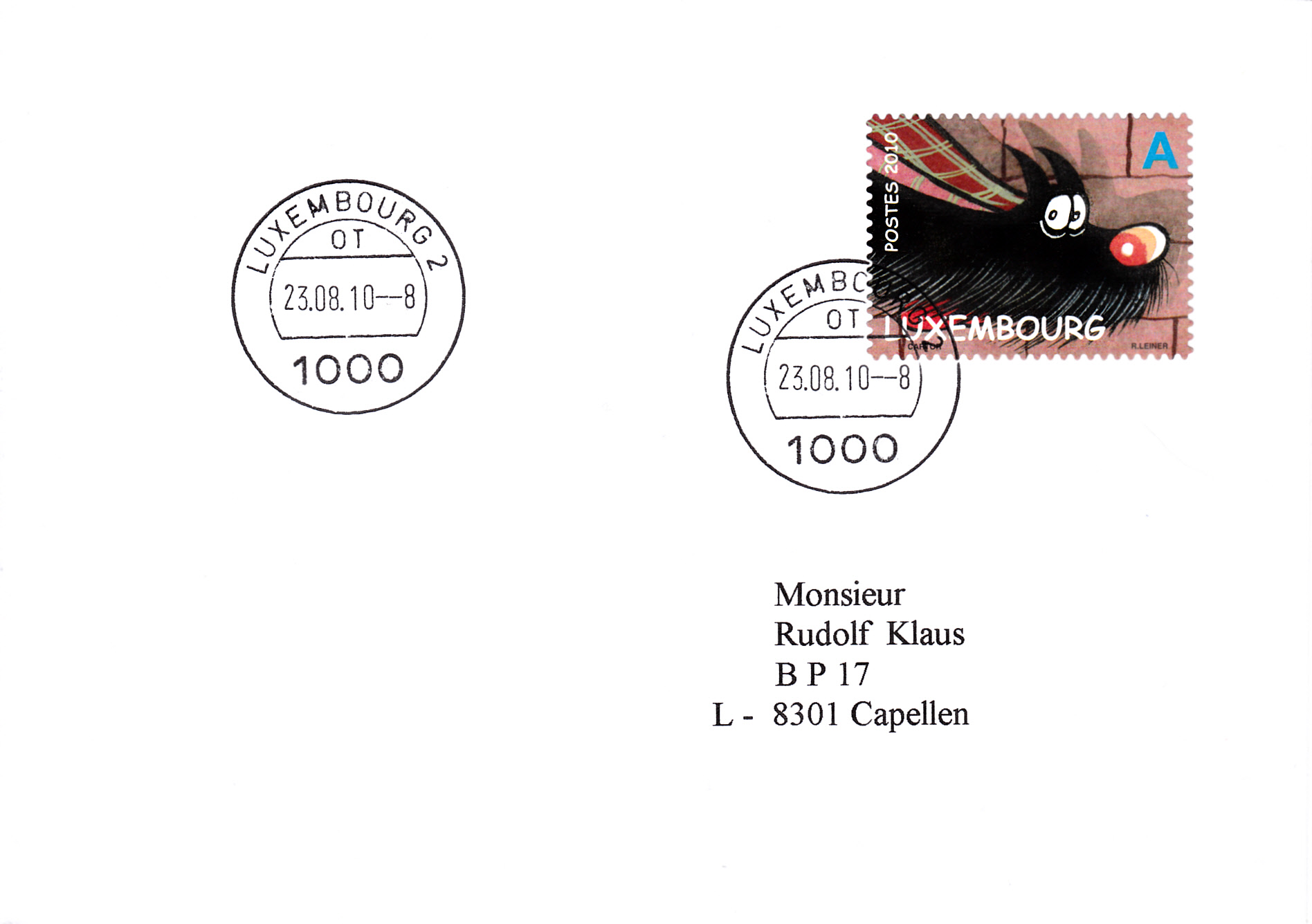 Ich kann hier alle fünf Marken mit diesem Stempel und den Unterschriften von Roger Leiner (1955 - 2016; luxemburgischer Komikzeichner, Illustrator und Karikaturist) und Lucien Czuga (Autor), die zusammen den Comic "Superjhemp" auf den Markt brachten.