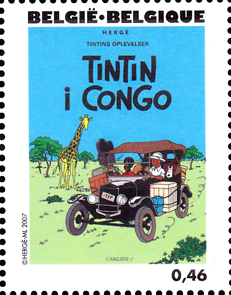 Marke (MiNr 3685) mit dem Titelbild des "Tim-und-Struppi-Albums "Tim im Kongo" (1930) in Dänisch.