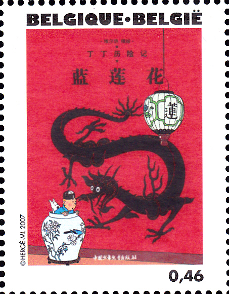 Marke (MiNr 3688) mit dem Titelbild des "Tim-und-Struppi-Albums "Der Blaue Lotos"" (1934) in Chinesisch.