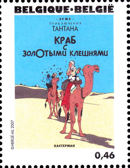 Marke (MiNr 3692) mit dem Titelbild des "Tim-und-Struppi-Albums "Die Krabbe mit den goldenen Scheren "" (1940) in Russisch.