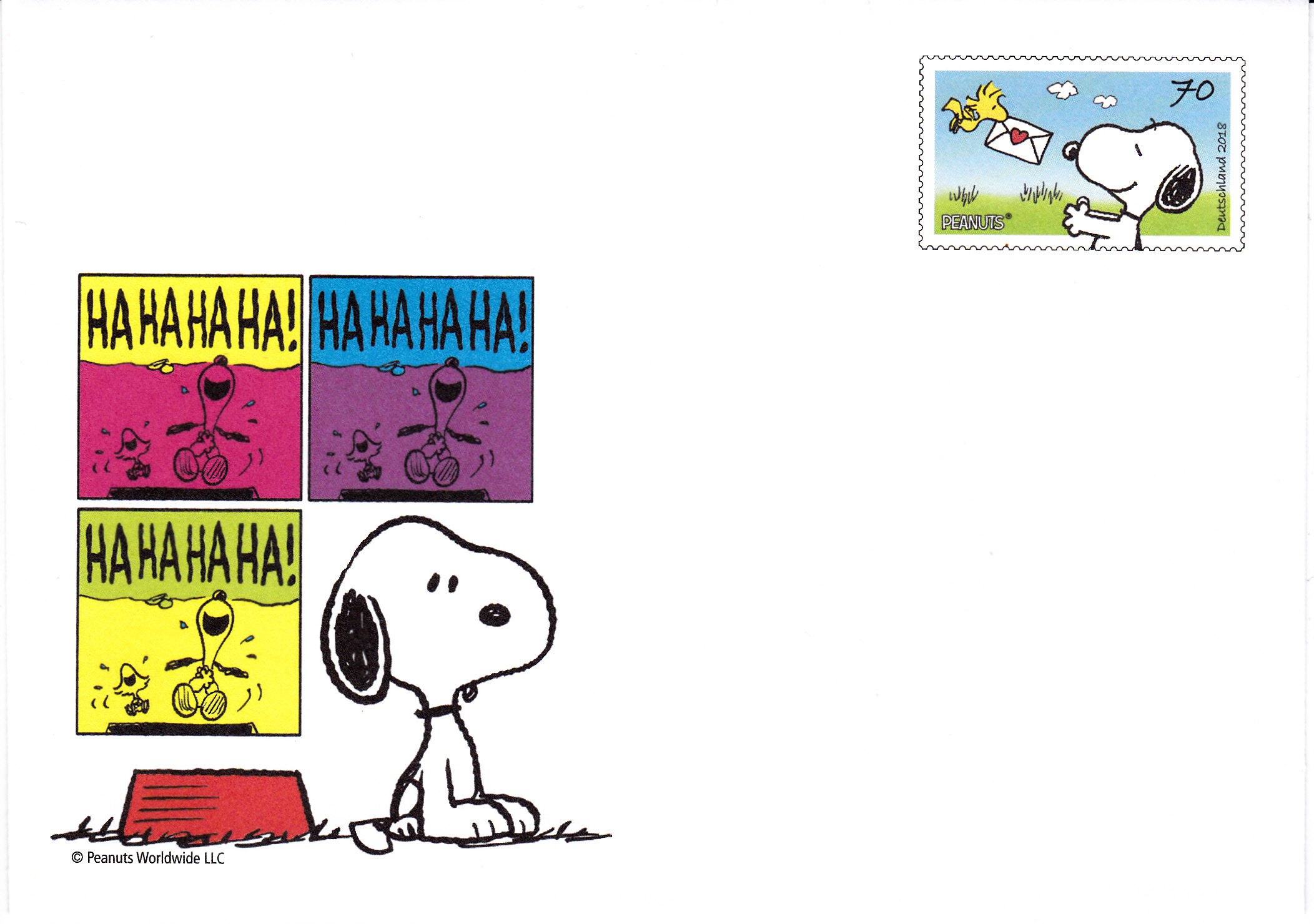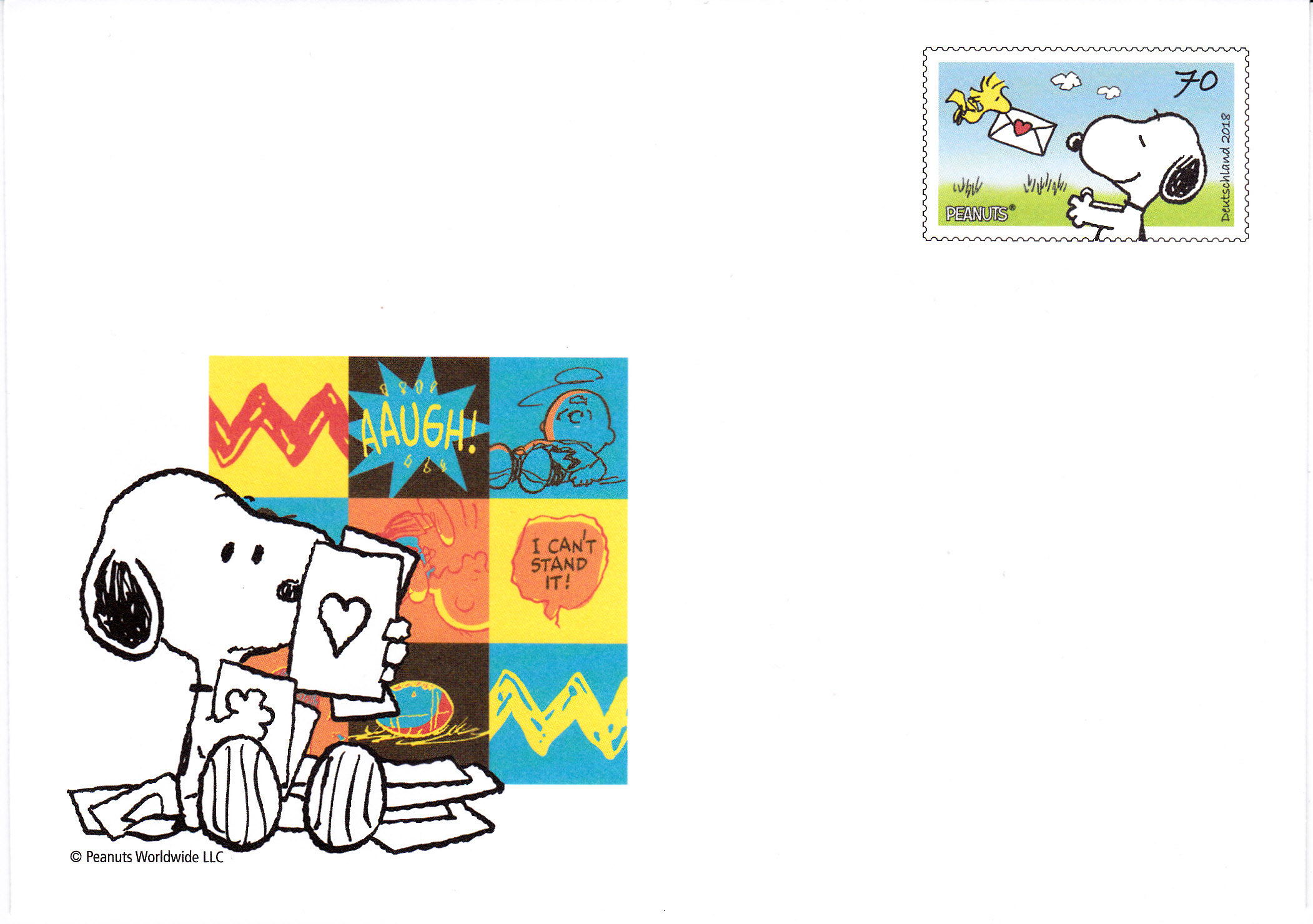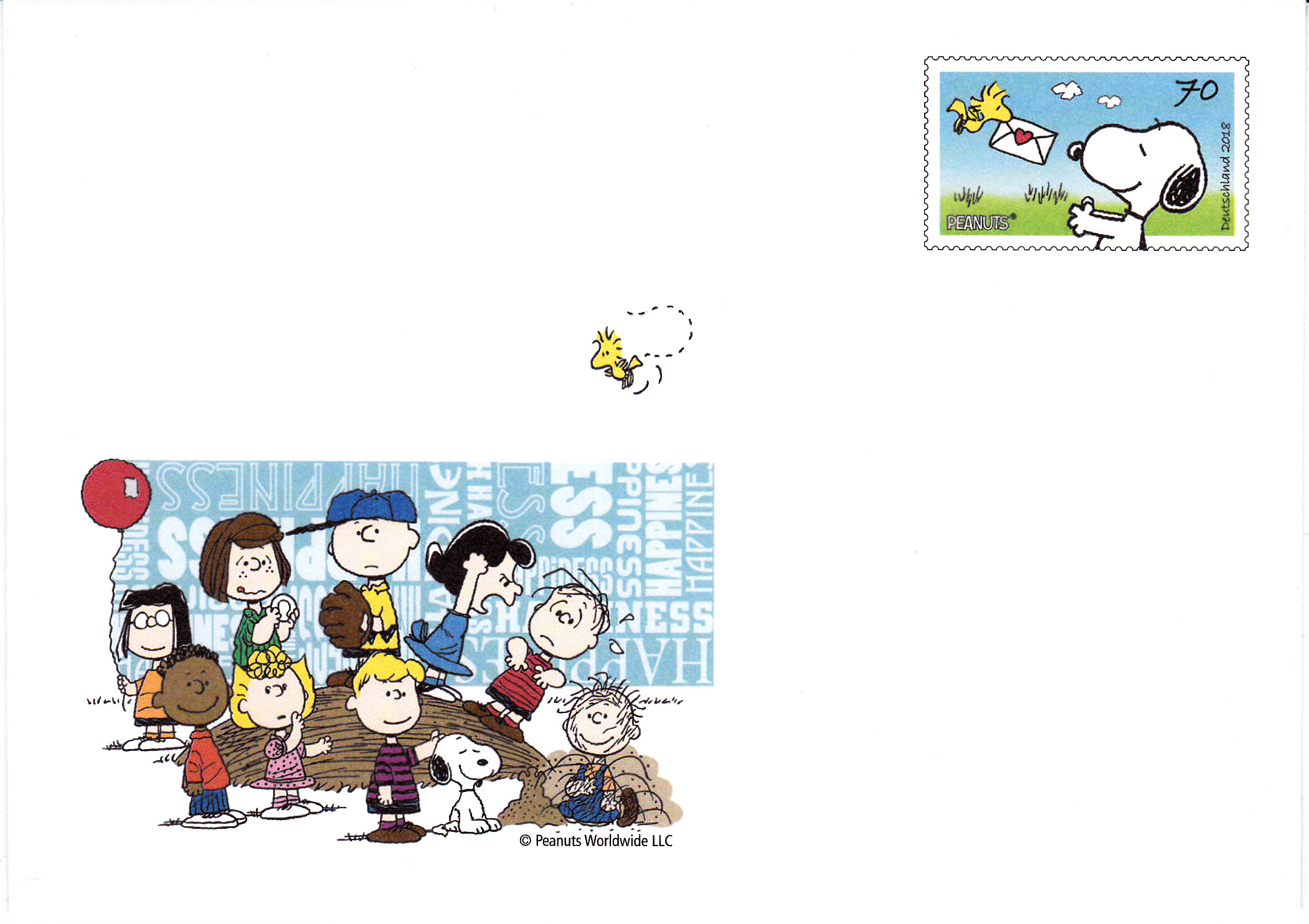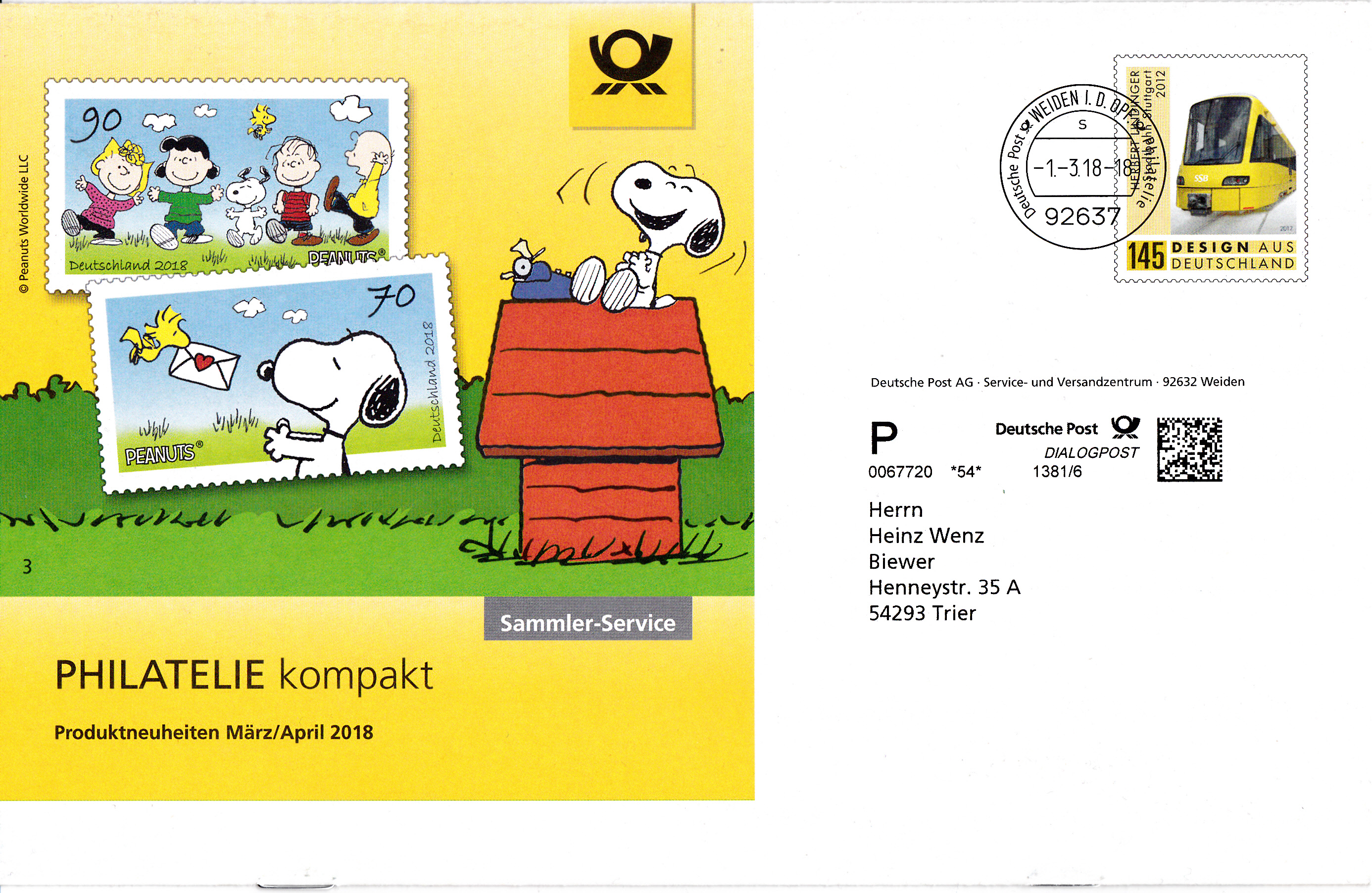 Auf dieser Broschüre im Format 235 x 152 mm (unten geheftet), eine Eigenausgabe der Deutschen Post, mit dem Wertstempel einer 145 Cent Marke "Stadtbahn Stuttgart von Herbert Lindinger" (MiNr 3349) aus der Serie "Design aus Deutschland" und der Vorausentwertung mit dem Datum "-1.-3.18-18" ist auf der linken Seite Werbung für die beiden Peanuts-Marken zu finden. Diese Eigenausgabe der Post passt somit auch in eine Sammlung zu den Peanuts.