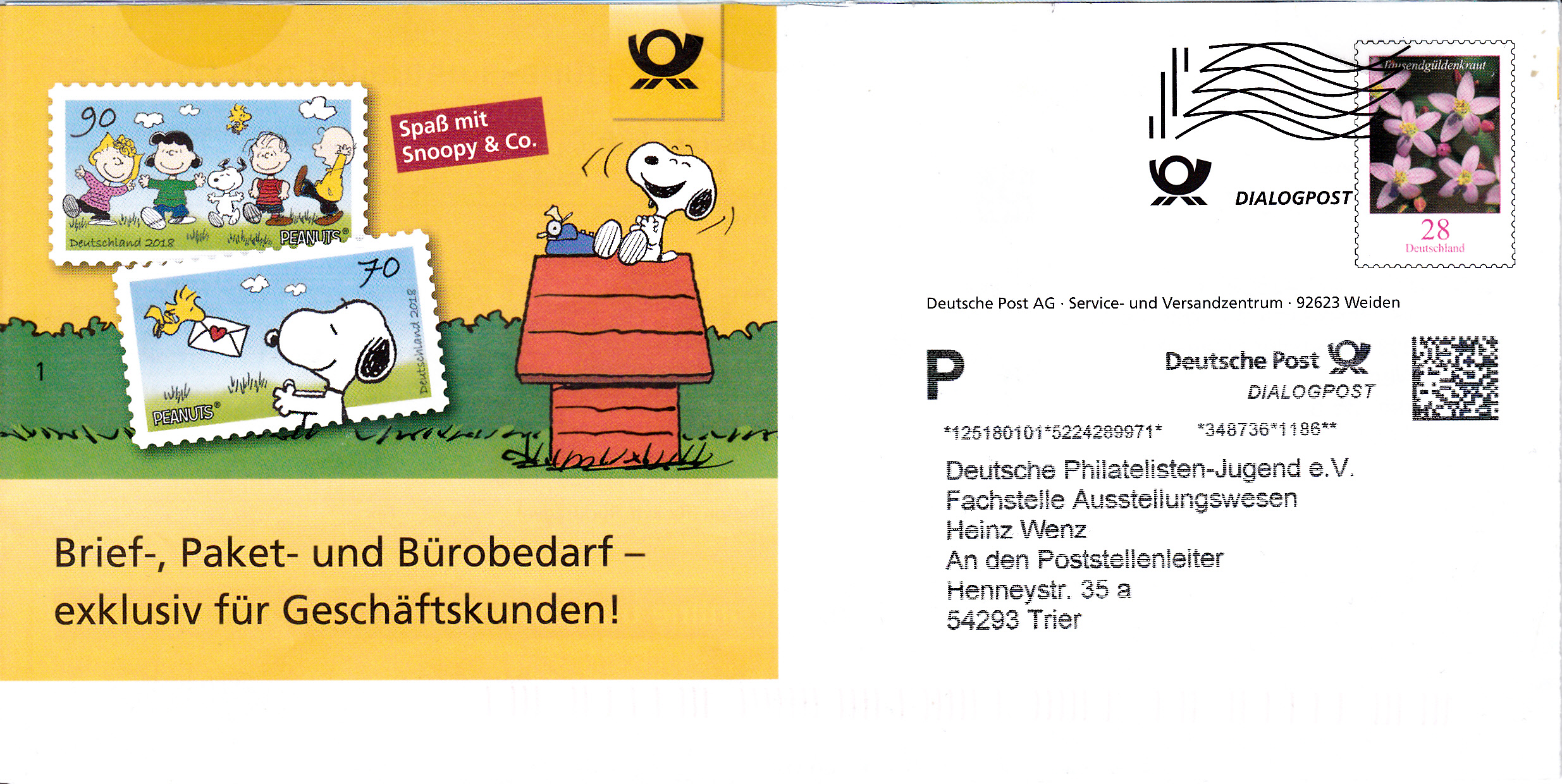 Auf diesem Faltbrief 210 mm x 108 mm mit Wertstempel aus der DS "Blumen" zu 28 Cent "Echtes Tausendgüldenkraut (Centaurium erythraea)" mit einer Frankierwelle "Dialogpost" wird mit der gleichen Darstellung für die Peanuts-Marken geworben.