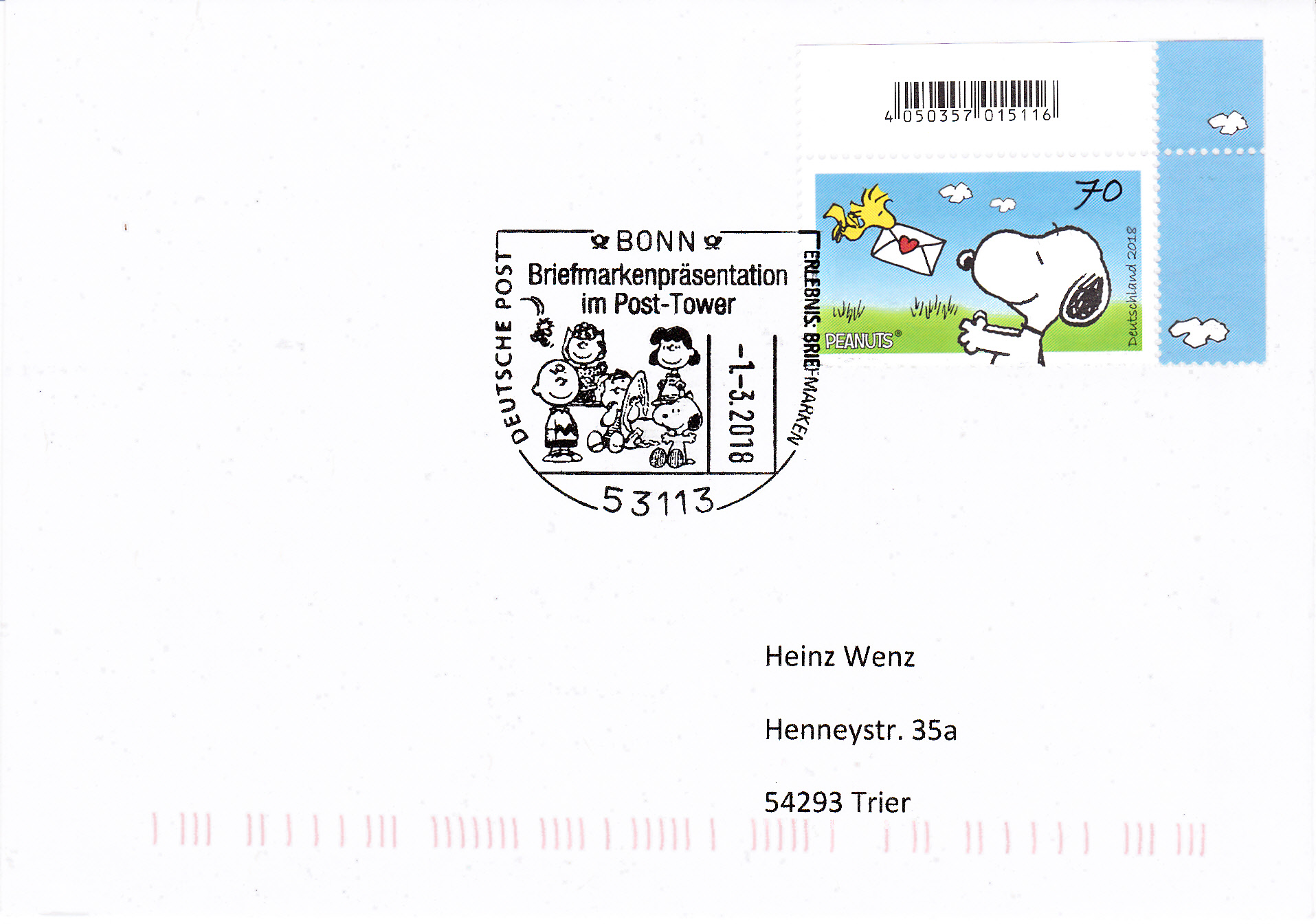 Es gibt auch noch drei Plusbriefe mit dem Wertstempel der 70C-Marke mit der Zeichnung "Snoopy" (MiNr 3369) mit aufgedruckter Zähnung, die zusammen mit drei Klappkarten verkauft wurden.