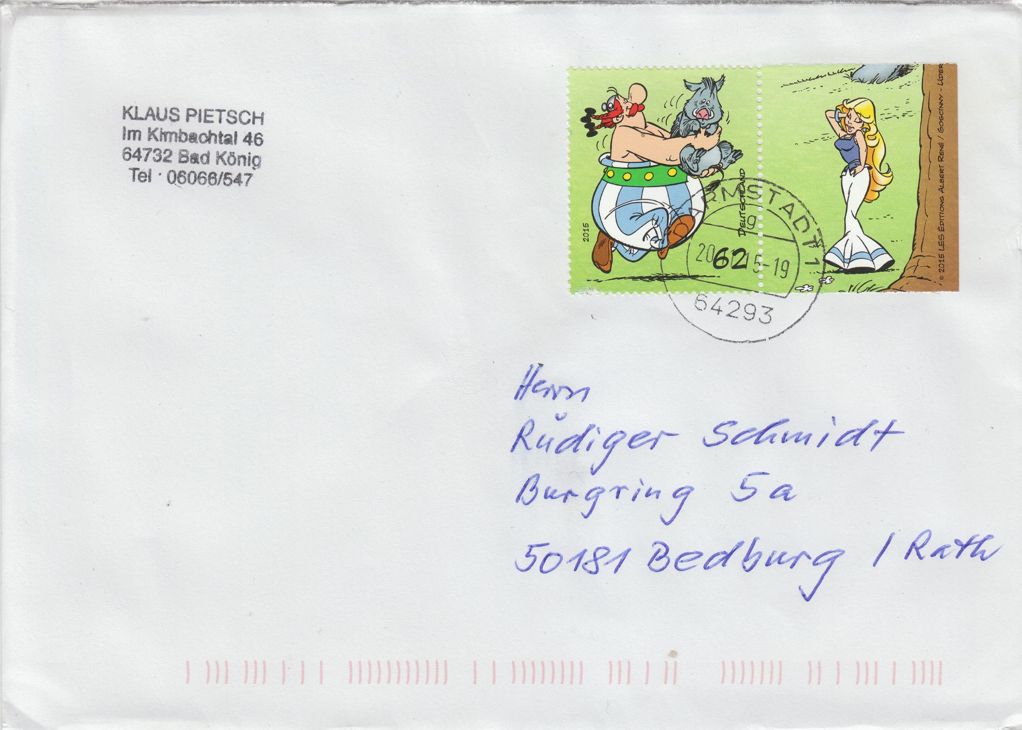 Für die selbstklebenden Marken aus dem sogenannten "Markenset" wurde ein eigener "Ersttagstempel" ein sogenannter "Erstverwendungsstempel" Bonn zur Abstempelung am 1.9.2015 benutzt. Hier sind Asterix und Obelix gemeinsam im Stempelbild. Hier ein Brief mit der Asterix-Marke.