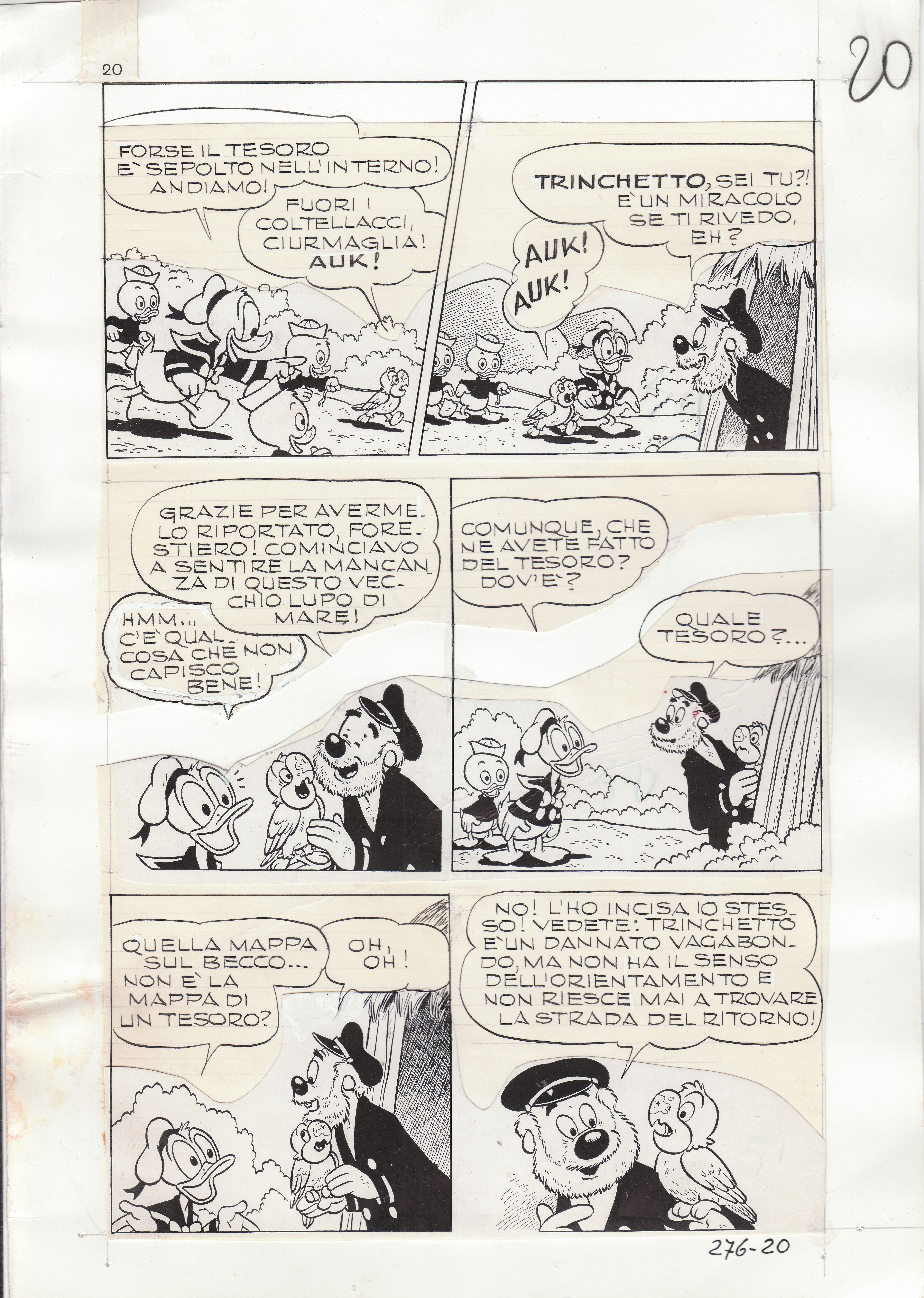 Vor allem in den 50’er und 60’er Jahren wurde der Hauptteil der weltweiten Disney Comicproduktion von den USA aus gesteuert. Von den dort abgelieferten Originalzeichnungen wurden Vorlagen gedruckt, danach wurden die Originalzeichnungen fast ausnahmslos vernichtet. Die verkleinerten Druckvorlagen wurden danach von Disney USA in alle Teile der Welt exportiert, um dort von Hand für den eigenen Markt überarbeitet zu werden. Und vor allem in Italien bestand eine fast unersättliche Begeisterung für Disney Comics. Dort wurden die US Druckvorlagen zunächst in mehrere Teile zerschnitten, wobei die englischen Texte ausgeschnitten wurden. Die Einzelteile wurden auf stabilen Karton geklebt, wobei das Seitenformat häufig geändert und dem eigenen Bedarf angepasst wurde. In den dabei zwischen den Bildern entstehenden Lücken wurden die Zeichnungen per Hand erweitert und es wurden per Hand die Sprechblasen mit den eigenen Texten ergänzt. Auf der Rückseite der eigenen Druckvorlage wurde häufig der Stempel des Verlags angebracht, der den Namen der Comicserie enthält und in den per Hand die Nummer des Heftes und die Seitenzahl ergänzt wurde, wo die Geschichte dann erscheinen sollte. Und fertig war die handgefertigte original Comic Druckvorlage für die eigenen Comichefte. Überwiegend ist es also keine per Hand gefertigte Originalzeichnung, aber ebenso ein neues und handgefertigtes Einzelstück. Und genau wie der Großteil der ursprünglichen Originalzeichnungen wurden auch die original Comic Druckvorlagen meistens leider direkt nach der Produktion der Comichefte vernichtet. Deshalb werden auch diese original Druckvorlagen nur selten angeboten und sind schwer zu finden. Ihre Einmaligkeit macht diese handgefertigten original Comic Druckvorlagen in den letzten Jahren zu einem immer beliebteren Sammelgebiet bei Comicfans. Besonders bei Geschichten von denen definitiv keine Originalzeichnungen mehr existieren, oder deren Originalzeichnungen unverkäuflich oder viel zu kostspielig sind, ist eine original Comic Druckvorlage eine wunderbare Alternative.