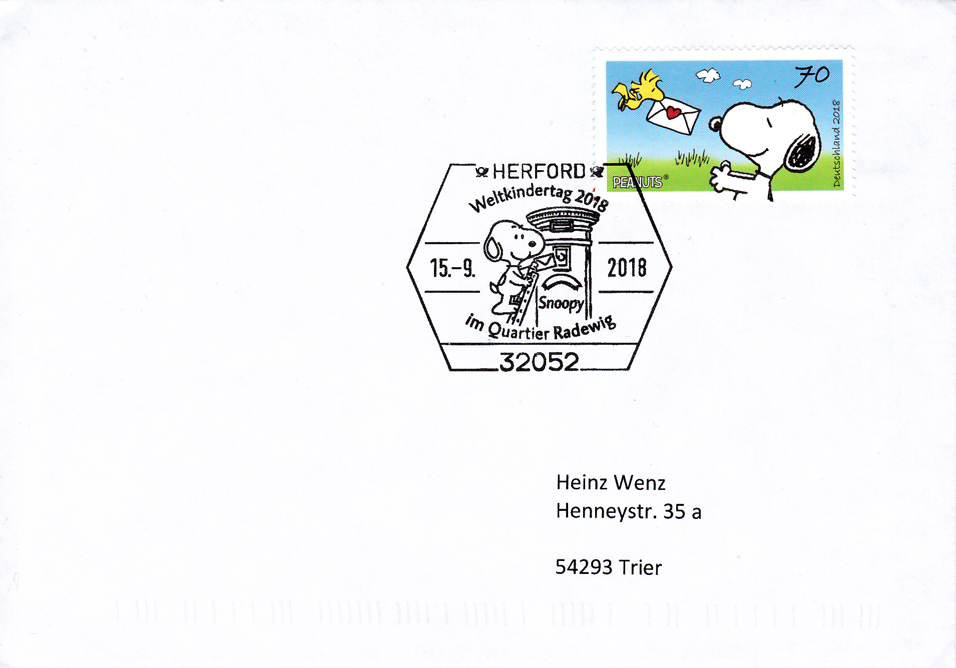 Sonderstempel vom 15.9.2018 aus Herford zum Weltkindertag mit Snoopy beim Einwerfen eines Briefes in einen Briefkasten.