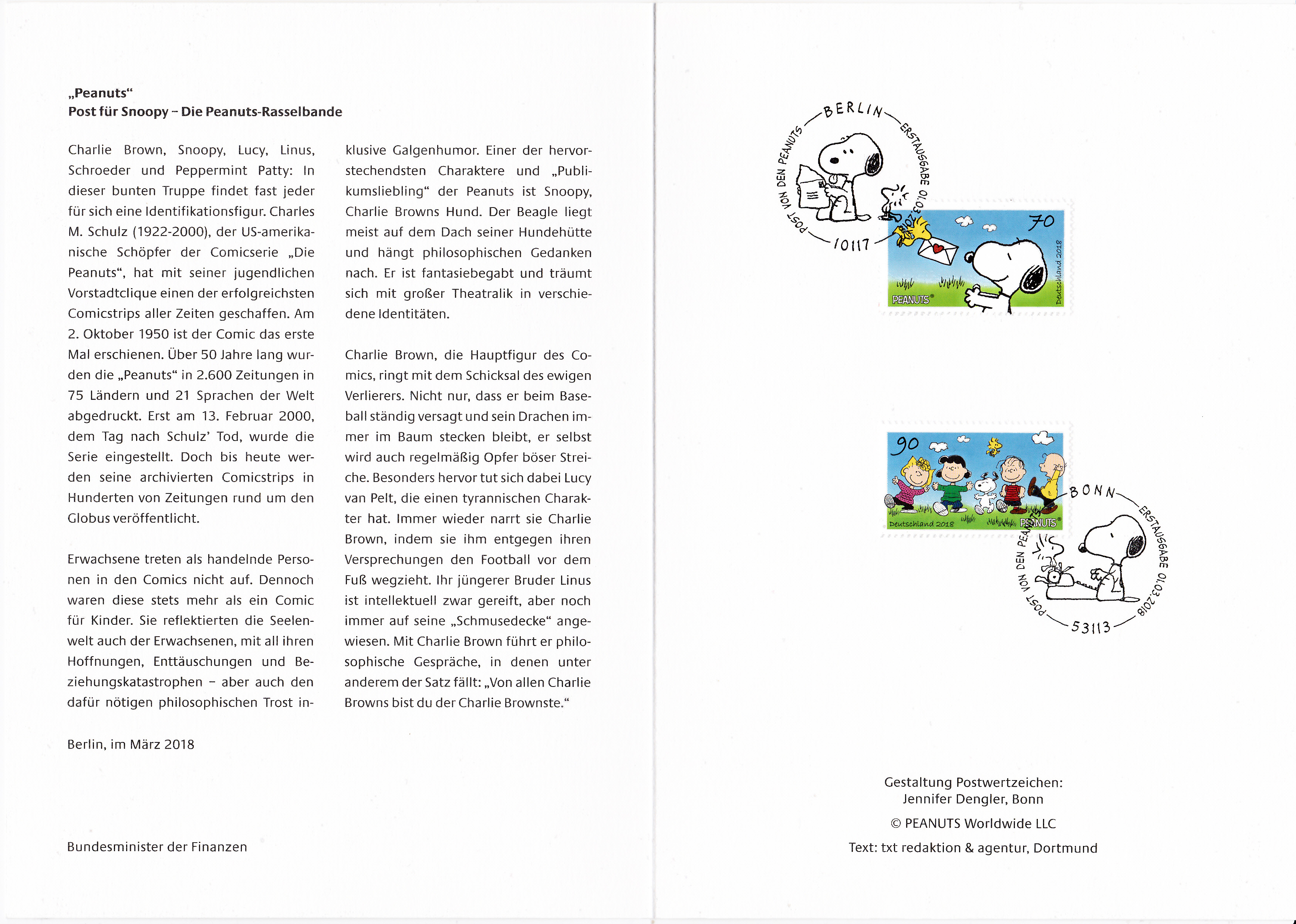 Die Ministerkarte der Ausgabe "Comics: Die Peanuts" enthält eine Marke mit dem Motiv "Woodstock überbringt Snoopy einen Liebesbrief" mit dem Stempel Berlin und eine Marke mit dem Motiv "Die Peanuts-Rasselbande: Sally Brown, Lucy van Pelt, Snoopy, Woodstock, Linus van Pelt und Charlie Brown"mit dem Stempel Bonn. Diese Karten sind ohne Unterschrift des Finanzministers.