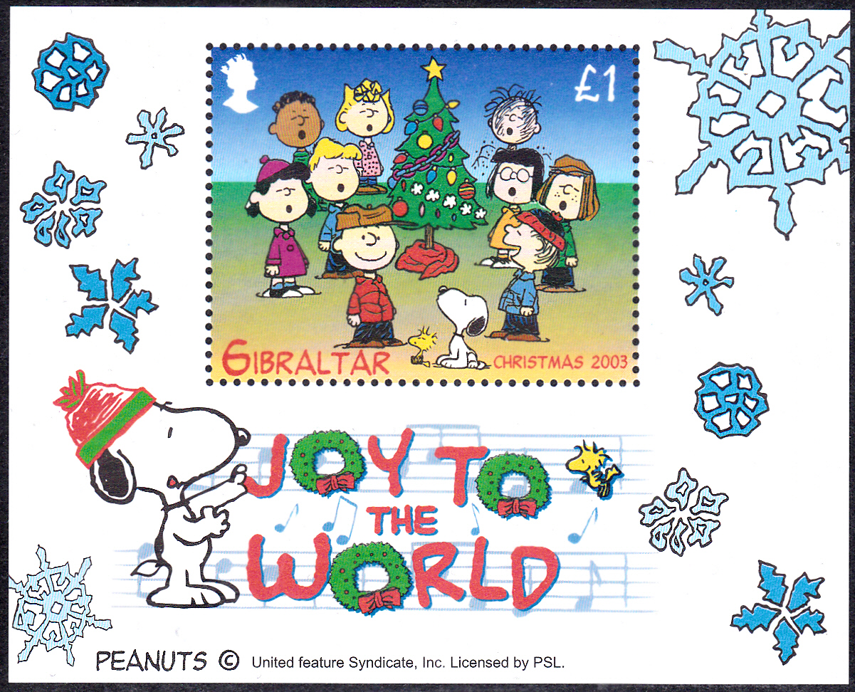 Aus Gibraltar kommt dieser Block (MiNr Block 58 mit Marke MiNr 1063). Die Marke zeigt "Die Peanuts am Weihnachtsbaum" nach einer Zeichnung von Charles M. Schulz (1922-2000; amerikanischer Comicautor).