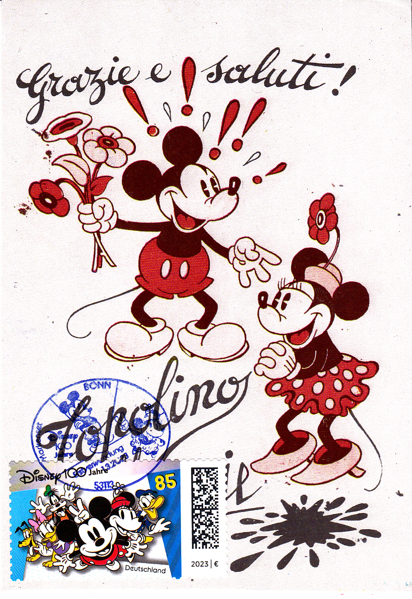 Hier zeige ich noch eine Maximumkarte mit Mickey Mouse und Minnie Mouse mit einer selbstklebenden Marke und dem Erstverwendungsstempel.