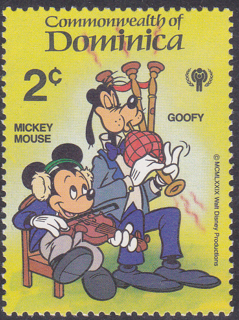 In der gleichen Serie zum Internationalen Jahr des Kindes ist 1981 in Dominica ist auch diese Marke (MiNr 659) erschienen. Sie zeigt Mickey Mouse beim Geigenspielen und Goofy mit einem Dudelsack.