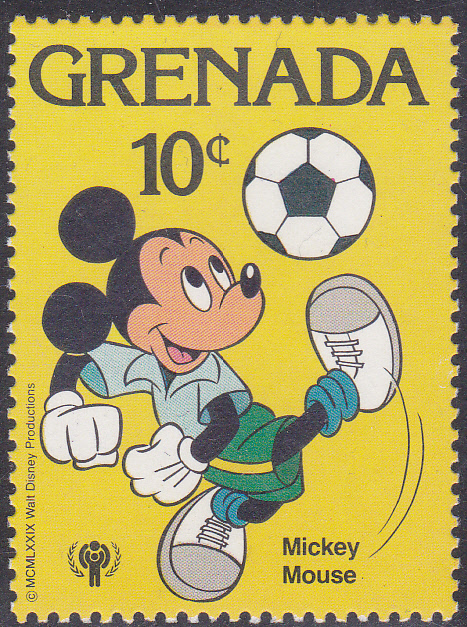 Eine weitere Marke aus dieser Serie aus Grenada (MiNr 997) zeigt Micky Maus als Fußballspieler.