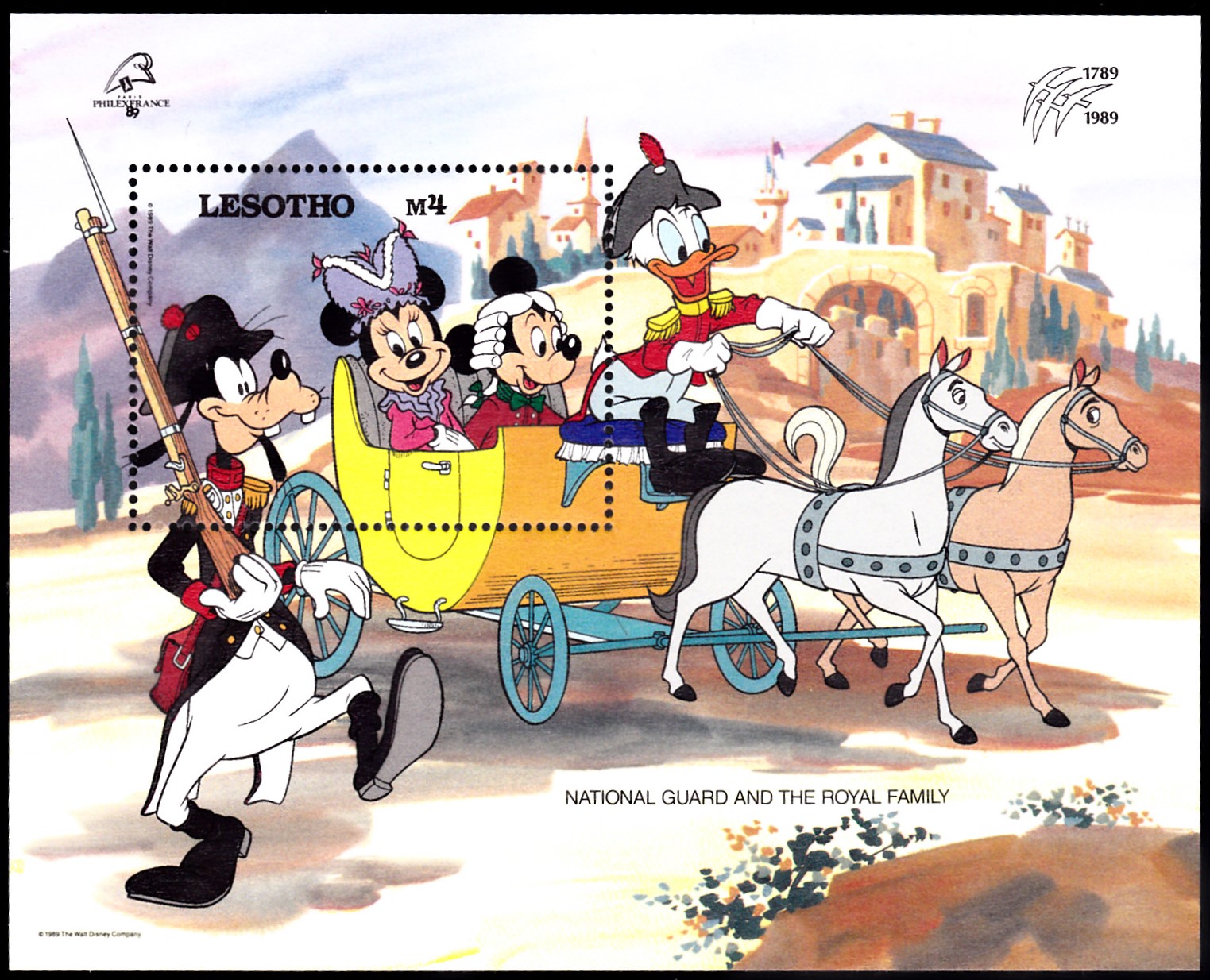 Dieser Block aus Lesotho (MiNr Block 62 mit Marke MiNr 775) zeigt Goofy, Minnie Maus, Micky Maus und Donald Duck.