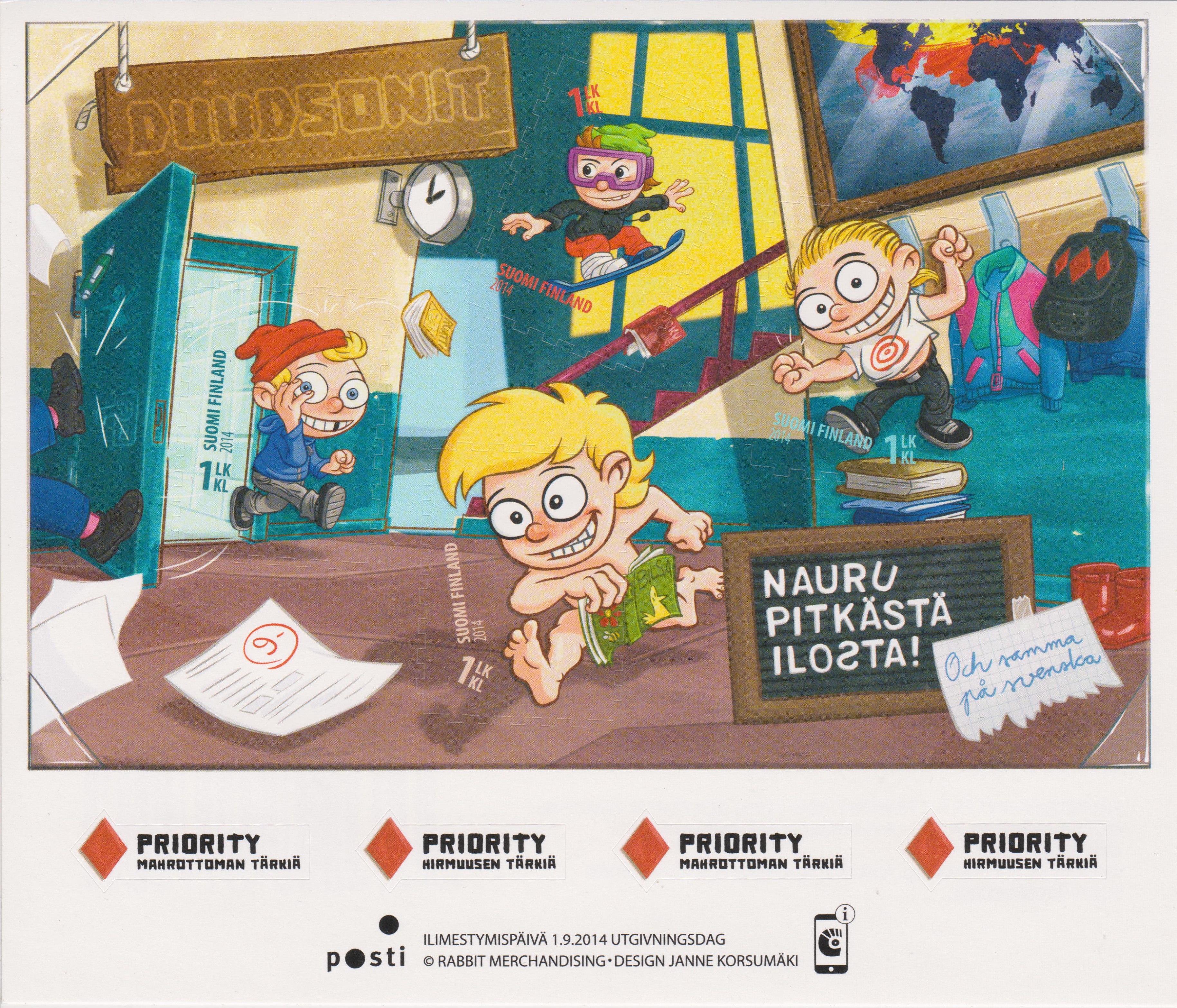 Auf dem Block hat jeder der vier Dudesons - Jarppi, Jukka, Jarno und HP - sein Bild auf einer Briefmarke erhalten. Die Briefmarken, die auf karikaturhafte Weise gezeichnet sind, sind Teil der Kampagne von The Dudeson gegen Mobbing in der Schule. Aber da es die Dudesons sind, gibt es auch Spaß auf den Briefmarken.