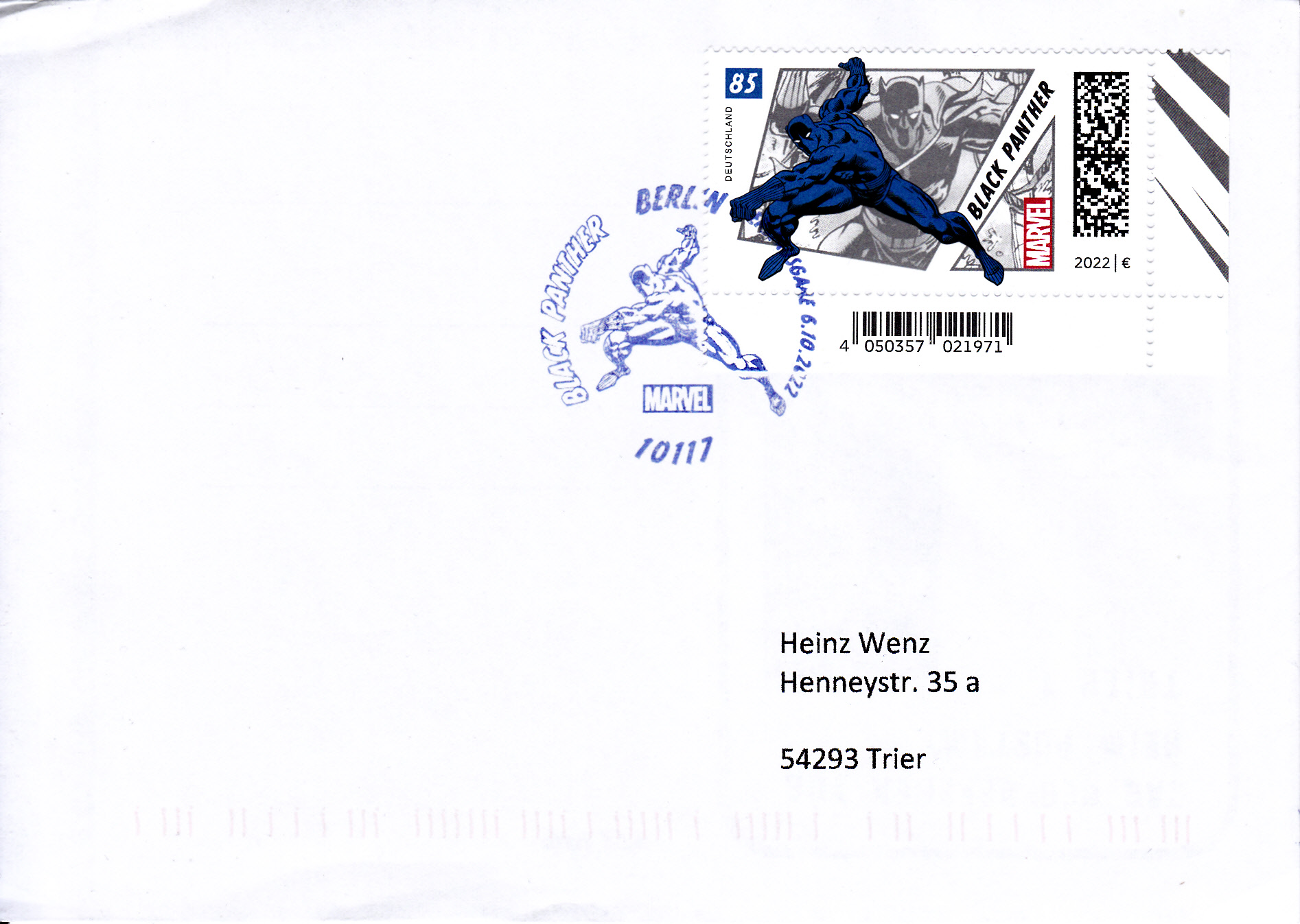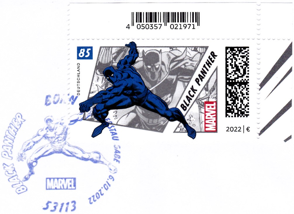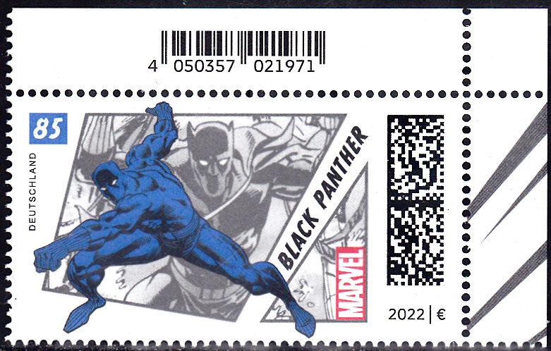Bei der Deutschen Post AG ist in der Serie "Superhelden" eine Marke (MiNr 3720) mit Black Panther in Kampfstellung erschienen. Hier zeige ich eine Marke vom Eckrand mit EAN-Codierung