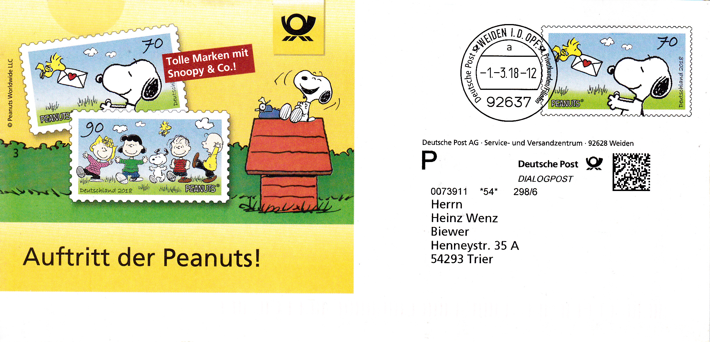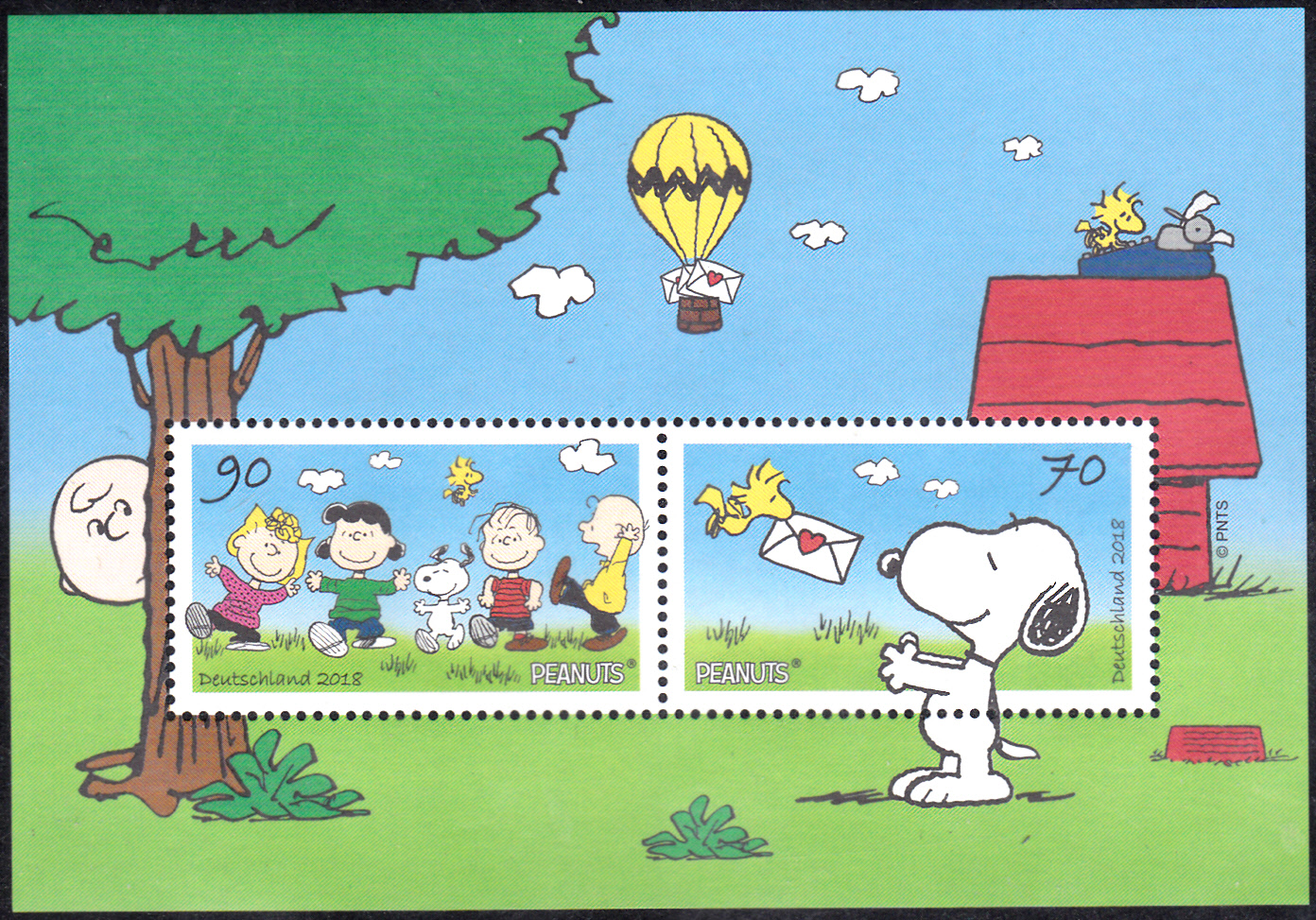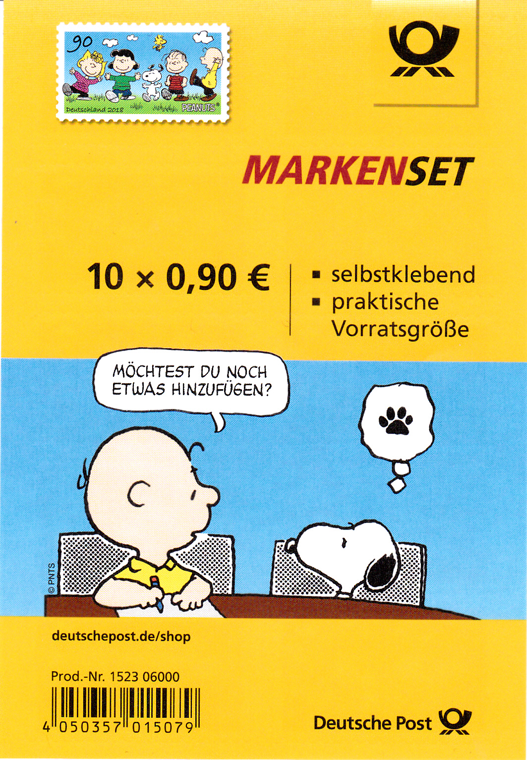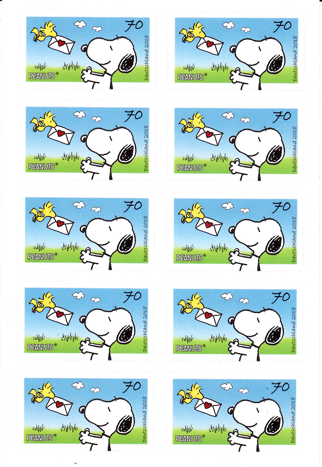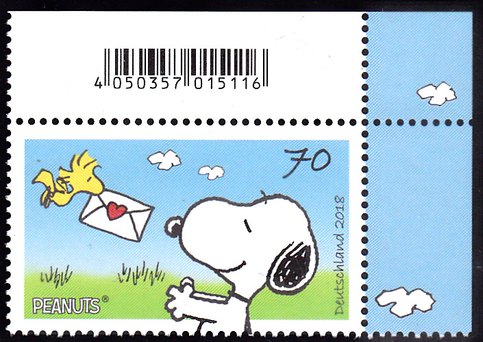 Auf dieser Marke der Deutschen Post zu 70 Cent (MiNr 3369) überbringt Woodstock, ein kleiner gelber Vogel, Snoopy, Charlie Browns Haushund, einen Liebesbrief. Hier eine Marke vom Eckrand mit EN-Code.