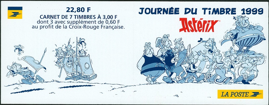 Zum Tag der Briefmarke 1999 erschien in Frankreich diese Asterix – Briefmarke mit Zierfeld, MiNr. 3367: