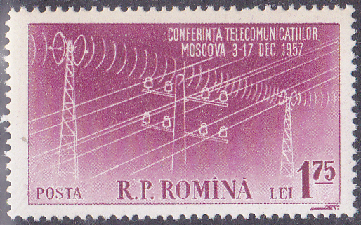 Auf dieser Marke aus Rumänien (MiNr 1700) zur Ministerkonferenz der Organisation der Postverwaltungen Sozialistischer Staaten (OSS) zeigt Kurzwellenmasten und eine Telegrafenleitung.