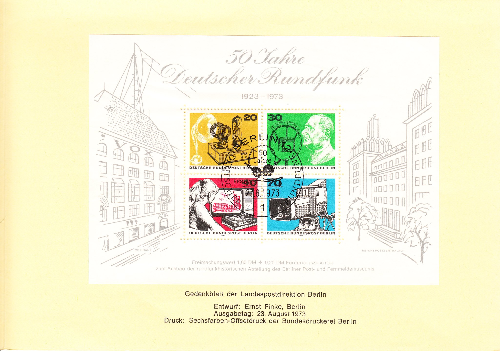Am 23.08.1973 erschien Berlin Block 4 in einer Auflage von 3.875.010 Stück zu einem Postverkaufspreis von 1,80 DM bei einem Freimachungswert von 1,60 DM.