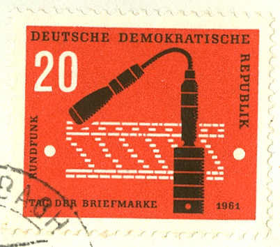Zum "Tag der Briefmarke 1961" erschien diese 20 Pfennig-Marke (MiNr. 862, orangerot/schwarz) mit dem MICHEL-Katalogtitel: "Studiomikrophon vor Skala eines Rundfunkempfängers".